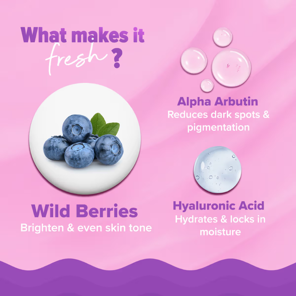 • Makes skin even and luminous: Infused with the perfect blend of wild berries and alpha-arbutin, it brightens and evens skin tone, targets dark spots, and treats pigmentation like a pro. The cherry on top – a hydration hug from hyaluronic acid!