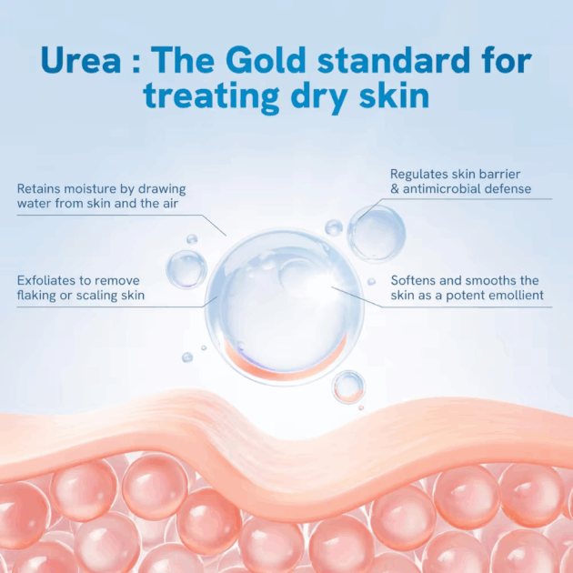 • Smoothens skin: Urea, known for its exceptional hydrating properties, helps soften and smoothen the skin by breaking down rough, thickened areas, promoting natural exfoliation, and retaining moisture.