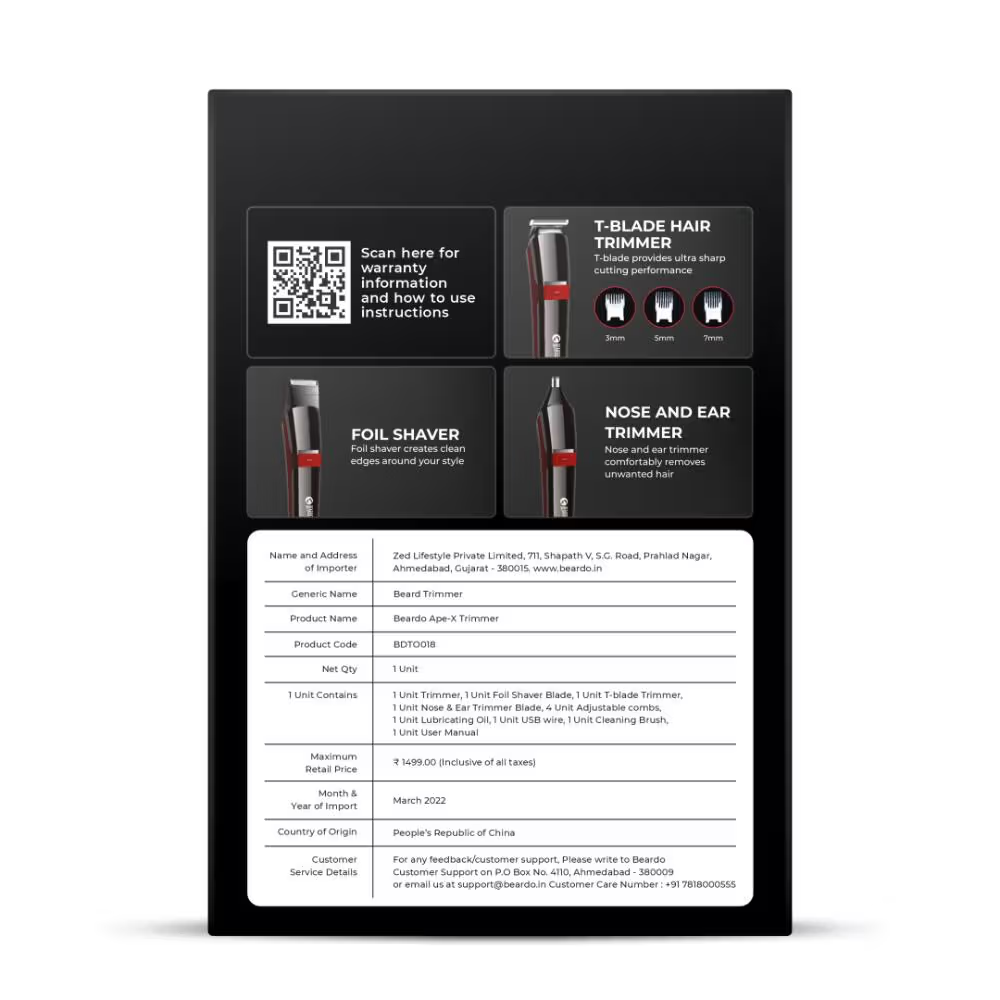 Beardo Apex 3 in 1 Professional Trimmer for hair, nose and manscaping! This trimmer runs for upto 120 minutes and is ergonomically designed making it easy to hold and use. It has self-sharpening rounded tips for smooth contact with skin to protect against nicks and cuts. It helps you trim those hard-to-reach areas. It allows both cord and cordless usage for flexible use on-the-go and comes with a USB charging port.