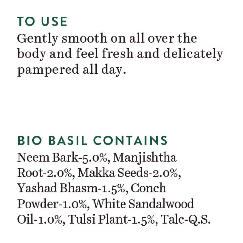 DescriptionThis cooling, pampering powder is a blend of pure basil, margosa, Indian corn and red sandalwood extracts, to help brighten body skin and keep it fresher and drier all day. Absorbs wetness and blocks odor. Leaves body skin silky-soft to the touch.Ingredients:Neem (Azadirachta indica), Manjistha (Rubia cordifolia), Makka (Zea mays), Tulsi (Ocimum sanctum), Rakt Chandan (Pterocarpus santalinus), Chandan (Santalum album), Yasad Bhasm, Shankh (Conch), Talc (Silicate of Magnesium) Q.S.BASIL AND SANDALWOODBasil originated in India and, for centuries, has been the beloved herb known for its curative, culinary and aromatic powers. Its anti-bacterial, anti-microbial nature offers soothing and uplifting effects to heal and refresh both the skin and senses AND Sandalwood comes from the sandal tree, native to India, and used through the ages for its soothing, pampering, protecting properties. It provides a significant natural defense against UV radiation.