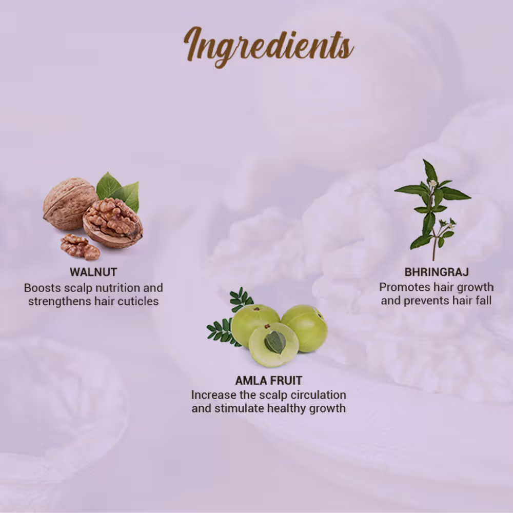 Akhrot chal (Jugens regia), Amla (Emblica officinalis), Ritha(Sapindus mukorossi), Bhringraj (Eclipta alba), Himalayan water Q.S.