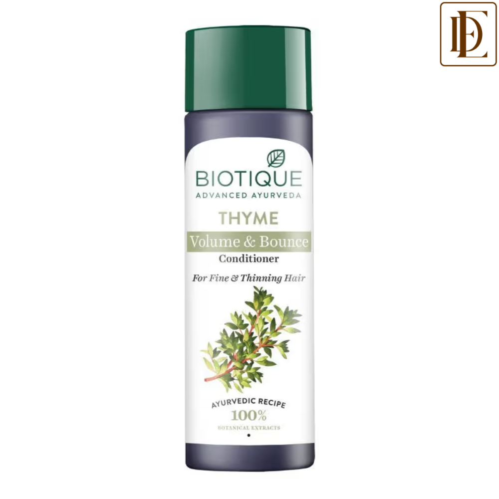 DescriptionThis volumizing formula conditions and hydrates hair. Thickens follicles, balances pH level and leaves hair looking fuller with sparkling shine.Ingredients:Ajwain (Trachyspermum ammi), Daruhaldi (Berberis aristata), Suraj mukhi tail (Helianthus annuus oil), Jaitun tail (Oleaeuropoea oil), Dharu tail (Lavendula stroechas oil), Pudina tail (Mentha arvensis oil), Soybean protein, Himalayan water Q.S.How to Use:Apply liberally to wet, cleansed hair and massage in gently, from scalp to ends. Rinse well with water.THYMEThyme is one of nature’s oldest and most vigorous herbs, agent of strength and other medicinal powers. It is an astringent, antiseptic, anti-fungal and aromatic n resource for keeping hair and body in healthy condition.OLIVE( Jaitun)The oil is rich in vitamin E that helps fight hair loss and it makes hair soft and shiny. Olive oil massages can improve the blood circulation in your scalpHow to Use: Suggested Product- BIO MOUNTAIN EBONYFRESH GROWTH STIMULATING SERUM INTENSIVE HAIR GROWTH TREATMENTThis intensive serum is blended with pure extracts of mountain ebony, long pepper, glycyrrhizin and the euphorbia tree, to promote new and healthy hair growth. Stimulates hair, from root to tip, and leaves scalp feeling toned, exhilarated, free from dryness and irritation.About BRAND:BIRTH OF THE BRAND:1992: The year that Biotique began