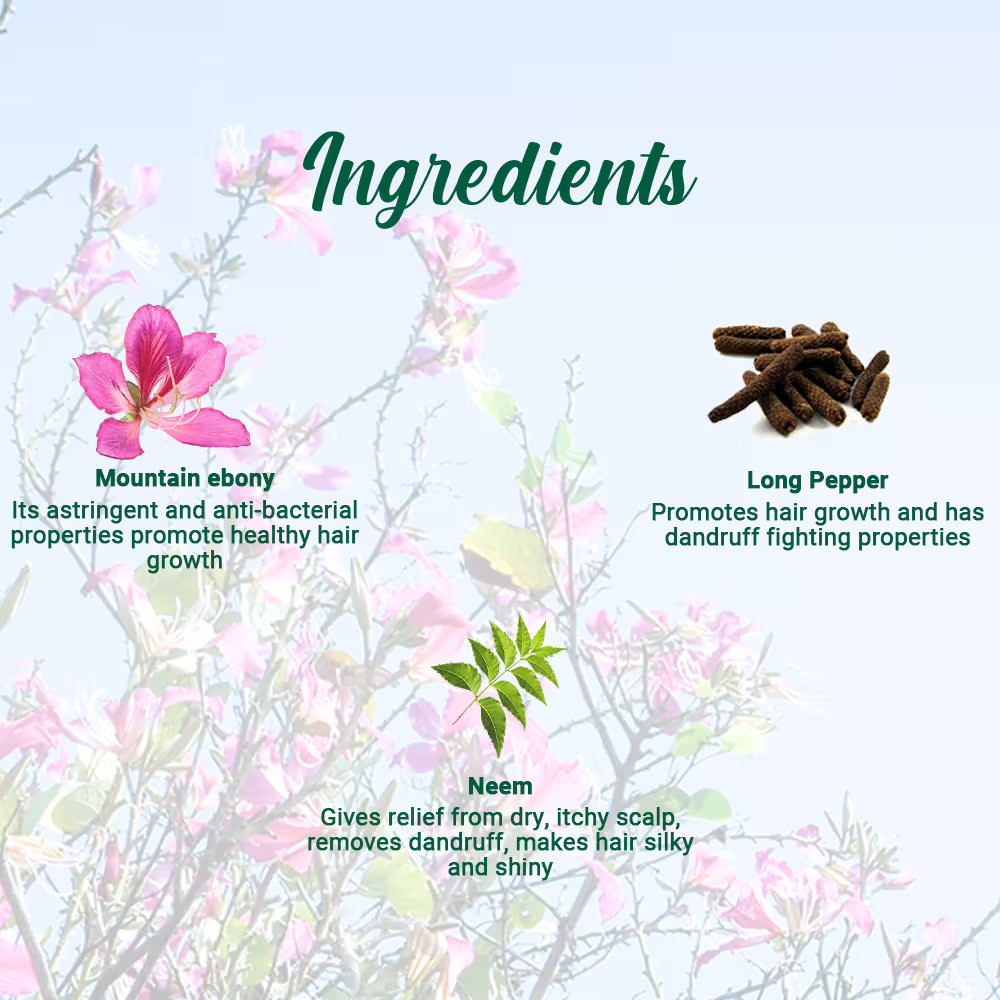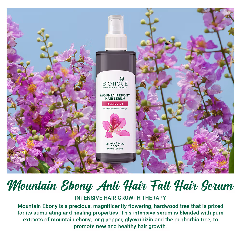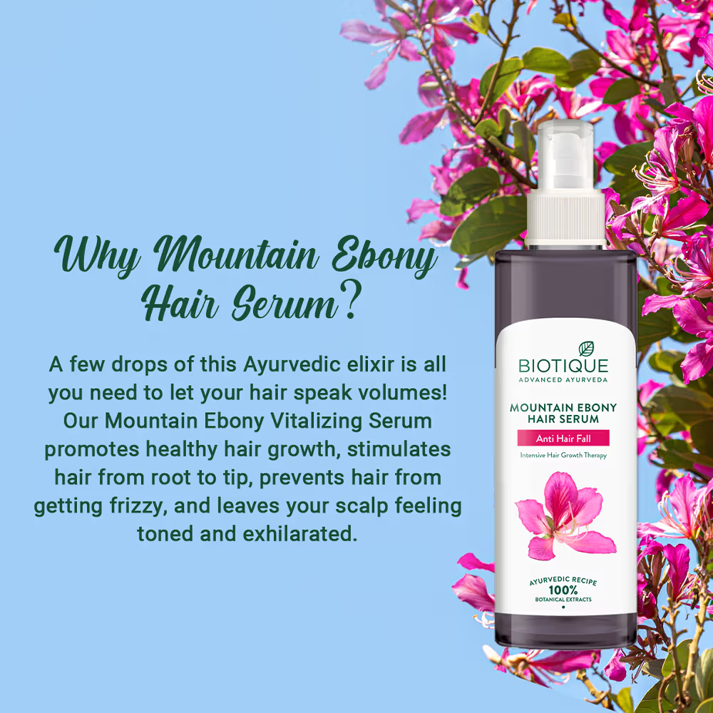 Mountain Ebony Is A Precious, Magnificently Flowering, Hardwood Tree That Is Prized For Its Stimulating And Healing Properties. This Intensive Serum Is Blended With Pure Extracts Of Mountain Ebony, Long Pepper, Glycyrrhizin, And The Euphorbia Tree, To Promote New And Healthy Hair Growth. Stimulates Hair, From Root To Tip, And Leaves Scalp Feeling Toned, Exhilarated, And Free From Dryness And Irritation. Also Contains Neem, Mint & Licorice. Biotique Mountain Ebony Vitalizing Serum For Falling Hair Intensive Hair Growth Treatment Is Infused With The Goodness Of Mountain Ebony, Neem, And Mulethi. This Elixir Is Designed To Let Your Hair Speak For Itself, With Just A Few Drops Unlocking Its Stimulating And Healing Properties. Our Ayurvedic Serum Is Enriched With The Power Of Mountain Ebony, A Beautiful Flowering Hardwood Tree That Helps To Promote Hair Growth. Combined With The Nourishing Properties Of Neem, Which Relieves Itchy Scalp And Eliminates Dandruff And Mulethi Soothes The Scalp And Prevents Scabs And Dandruff.