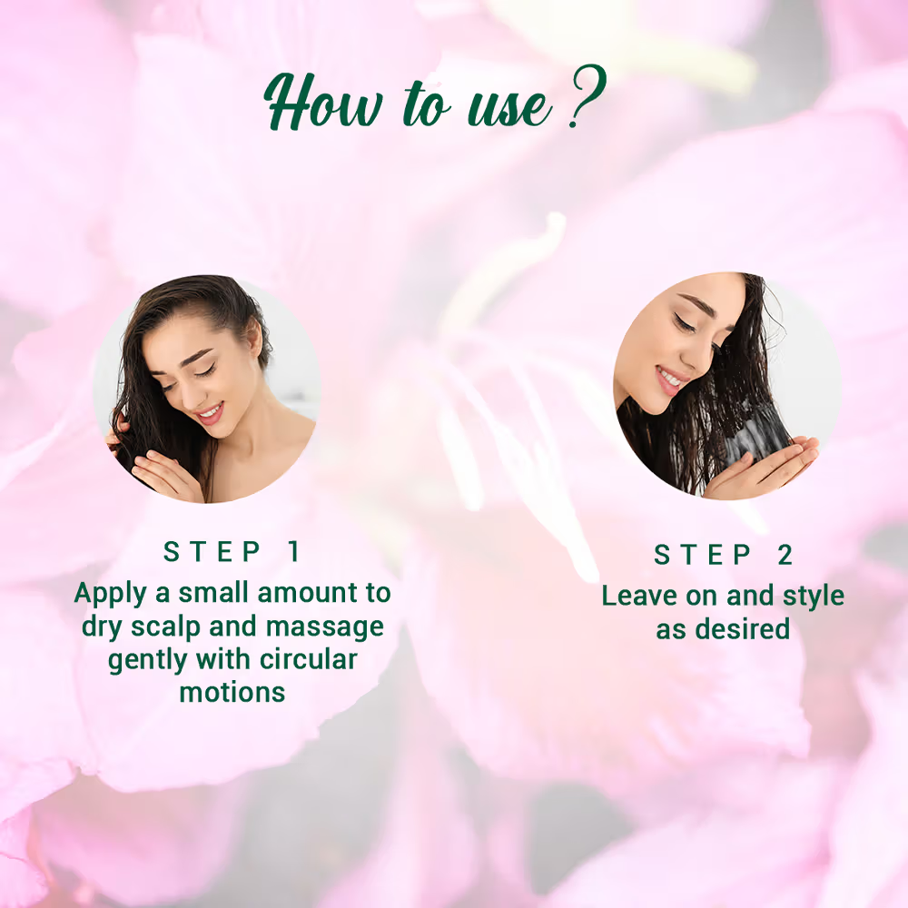 • Apply a small amount to your dry scalp and gently massage in circular motions. Leave it on and style your hair as desired.