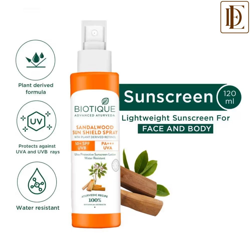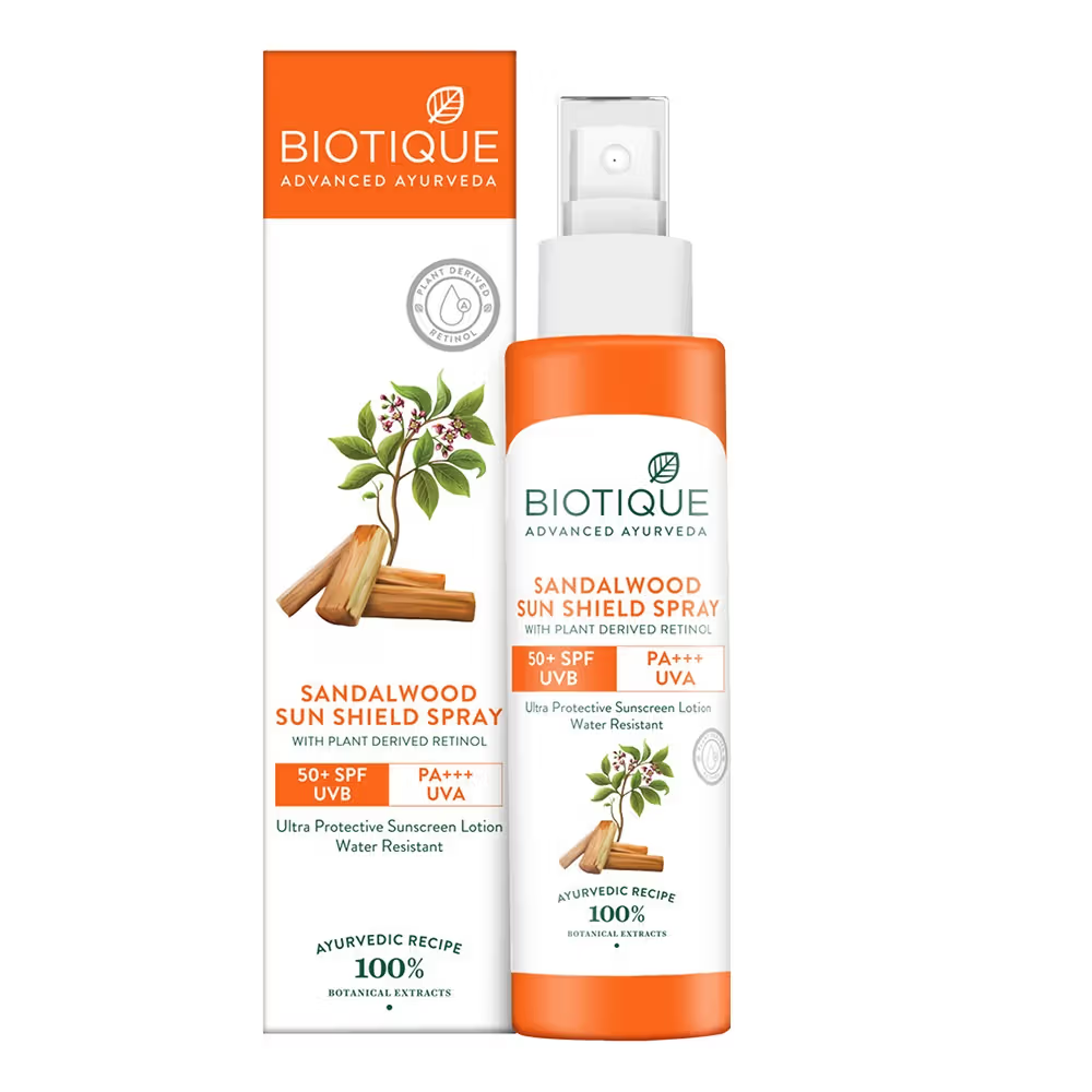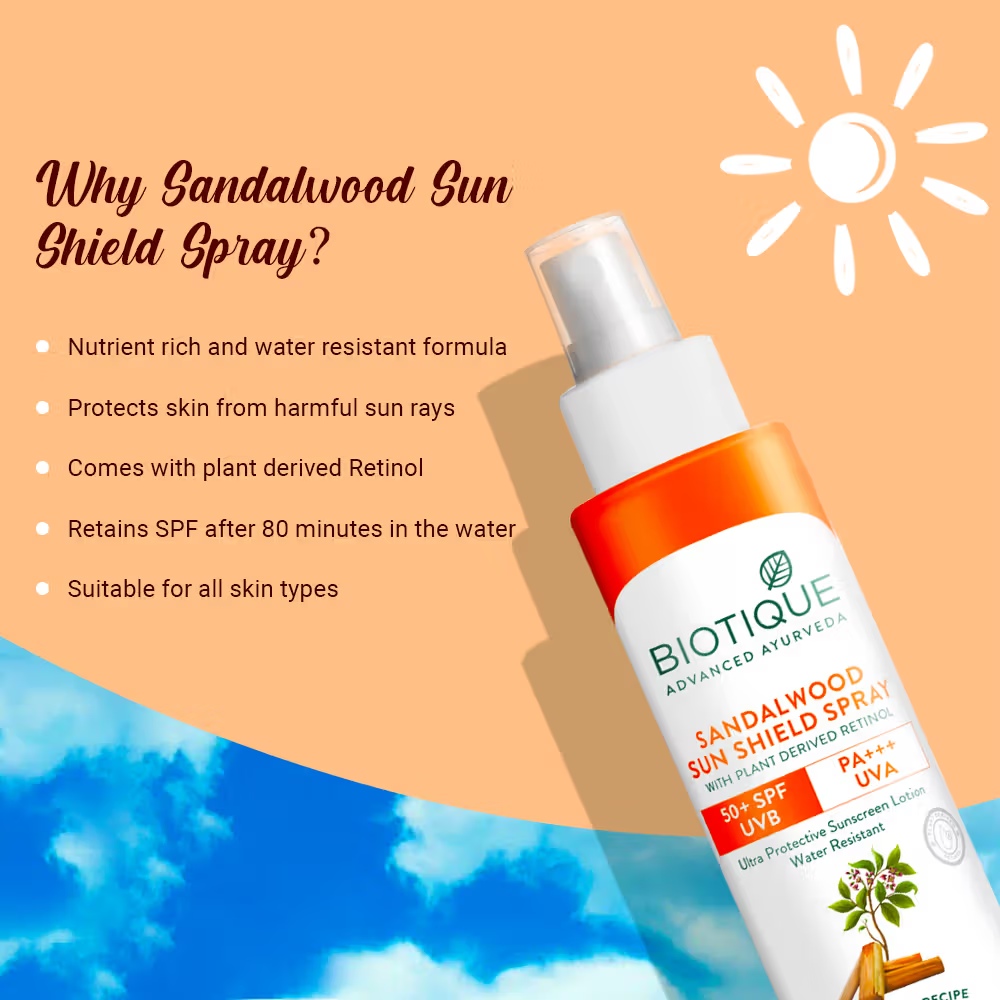 Ayurveda Skin Life Source Sandalwood Sun Shield Sprey, is a nutrient-rich, water-resistant formula with high UVA/UVB protection to hydrate and shield skin from sun damage and premature ageing.