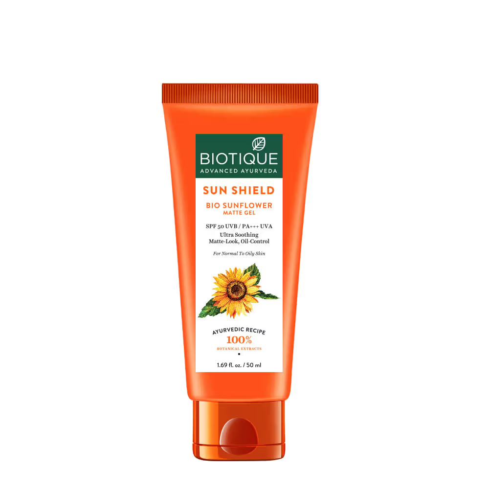 Biotique Sunflower Matte Gel Sunscreen has a unique gel formula and is a 100% Ayurvedic recipe with healing extracts of sunflower, ashwagandha and sesame to keep skin soft and moisturized. It is an ultra-soothing, oil-control sunscreen that protects skin with broad spectrum SPF 50 UVA/UVB and gives a flawless matte finish look.