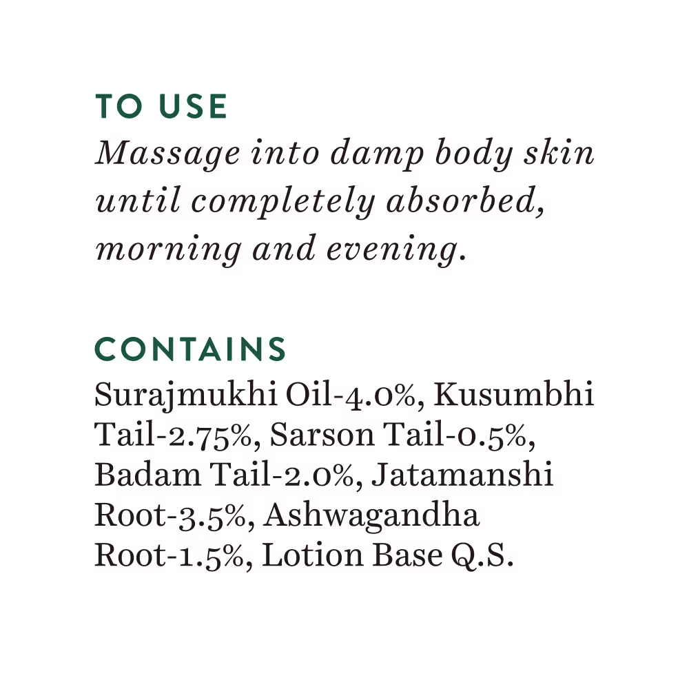 Surajmukhi tail (Helianthus annuus oil), Kusumbhi tail (Carthamus tinctorious oil), Sarsoan tail (Brassica nigra oil), Badam tail (Prunus amygdalus oil), Jatamansi (Nardostachys jatamansi), Ashwagandha (Withania somnifera), Lotion base Q.S.