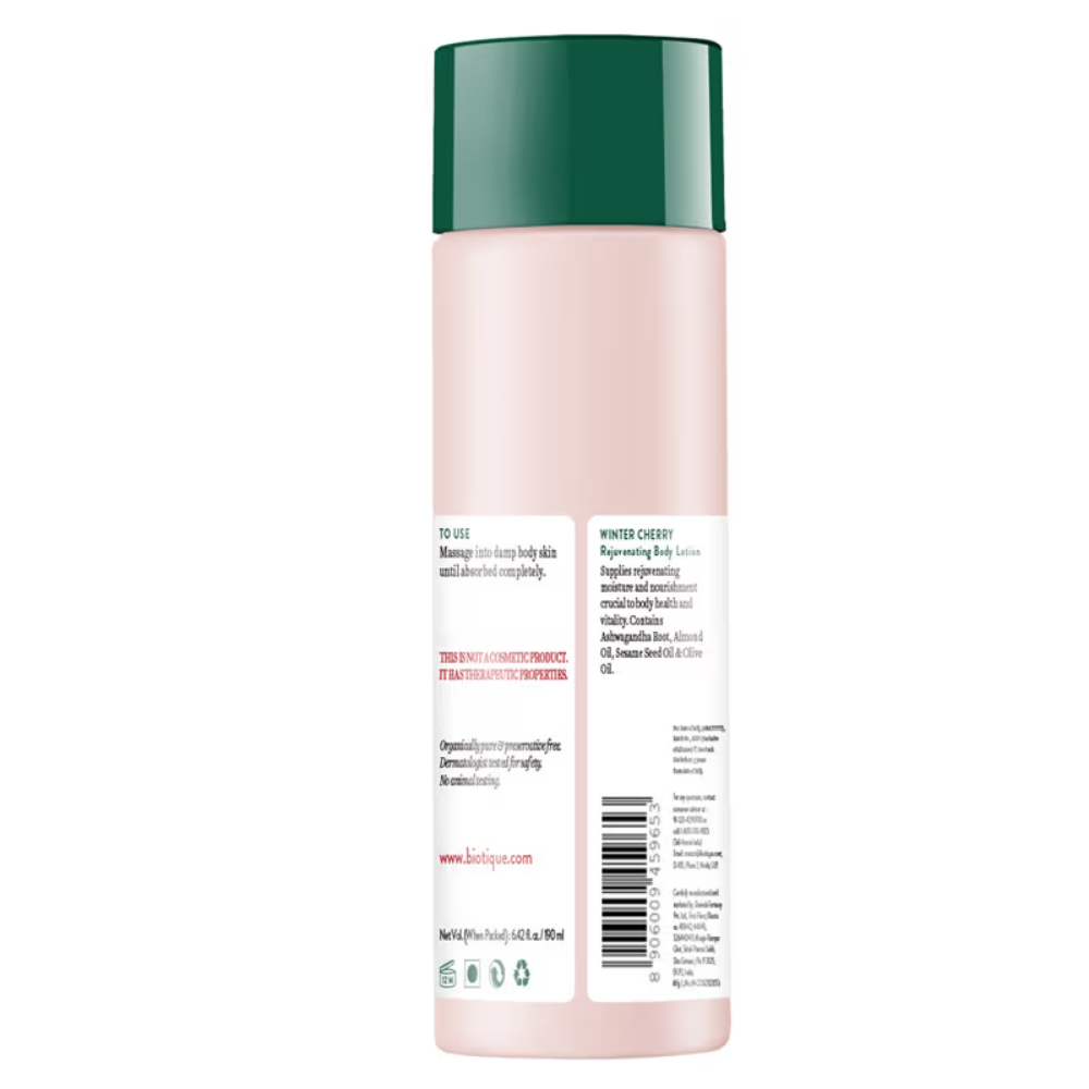 DescriptionThis nourishing lotion is a blend of pure winter cherry, sunflower, safflower, musk root and almond oil, to supply moisture and nutrients crucial to body health and vitality. Soothes, softens and revitalizes even weather-roughened body skin, as it promotes elasticity, suppleness and moisture balance.Ingredients:Surajmukhi tail (Helianthus annuus oil), Kusumbhi tail (Carthamus tinctorious oil), Sarsoan tail (Brassica nigra oil), Badam tail (Prunus amygdalus oil), Jatamansi (Nardostachys jatamansi), Ashwagandha (Withania somnifera), Lotion base Q.S.WINTER CHERRYWinter Cherry is one of the most rejuvenating botanical in nature, used for generations to revive and de-stress both body and senses.