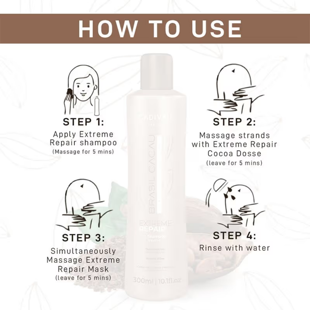 The perfect solution to recover your damaged hair, Cadiveu Professional Brasil Cacau Extreme Repair Shampoo acts on each hair fiber, recovering the hair from root to tip. Developed to effectively remove impurities, it promotes shine and moisturizes hair. It also protects hair against future damage while promoting maximum repair and vitality.