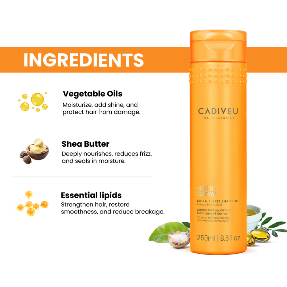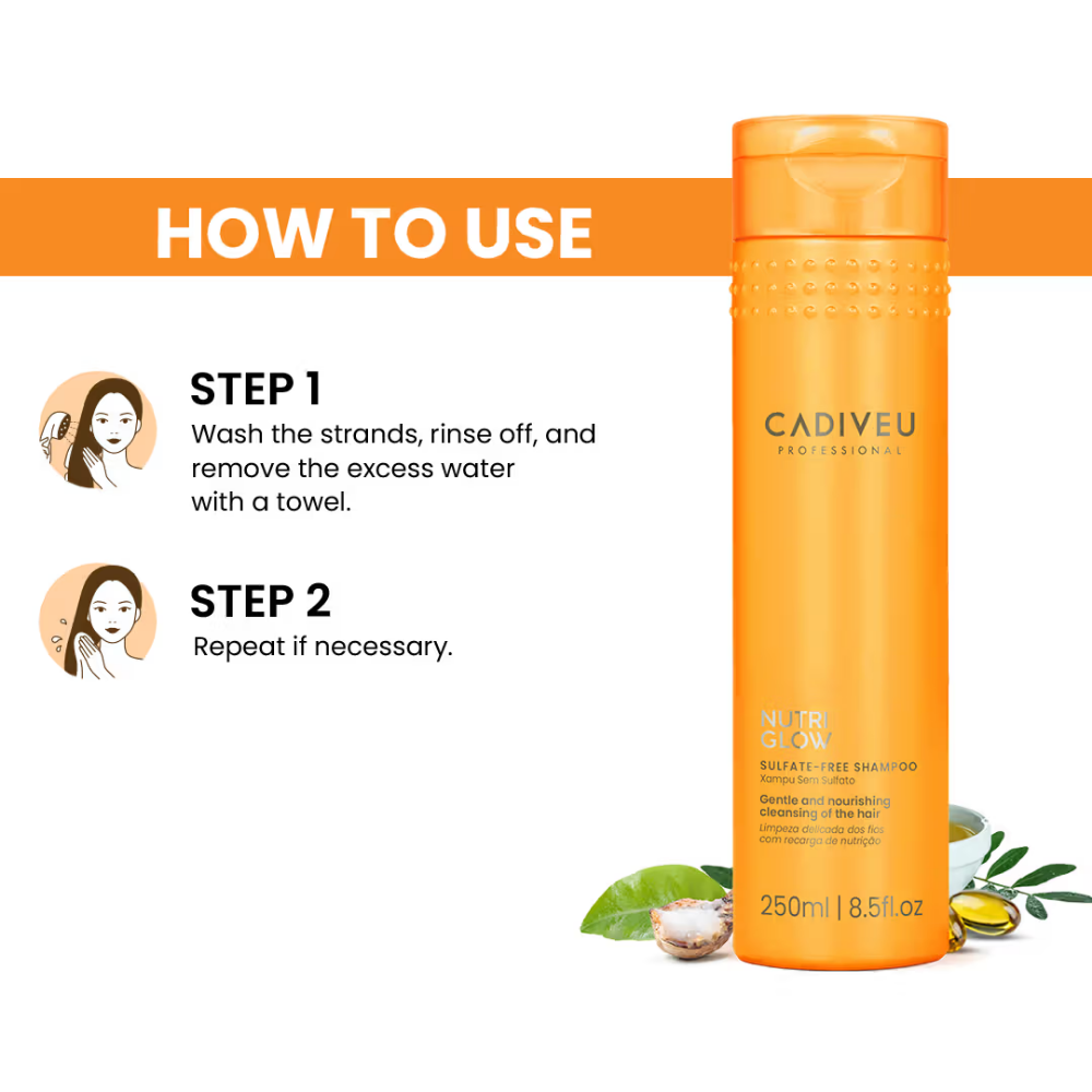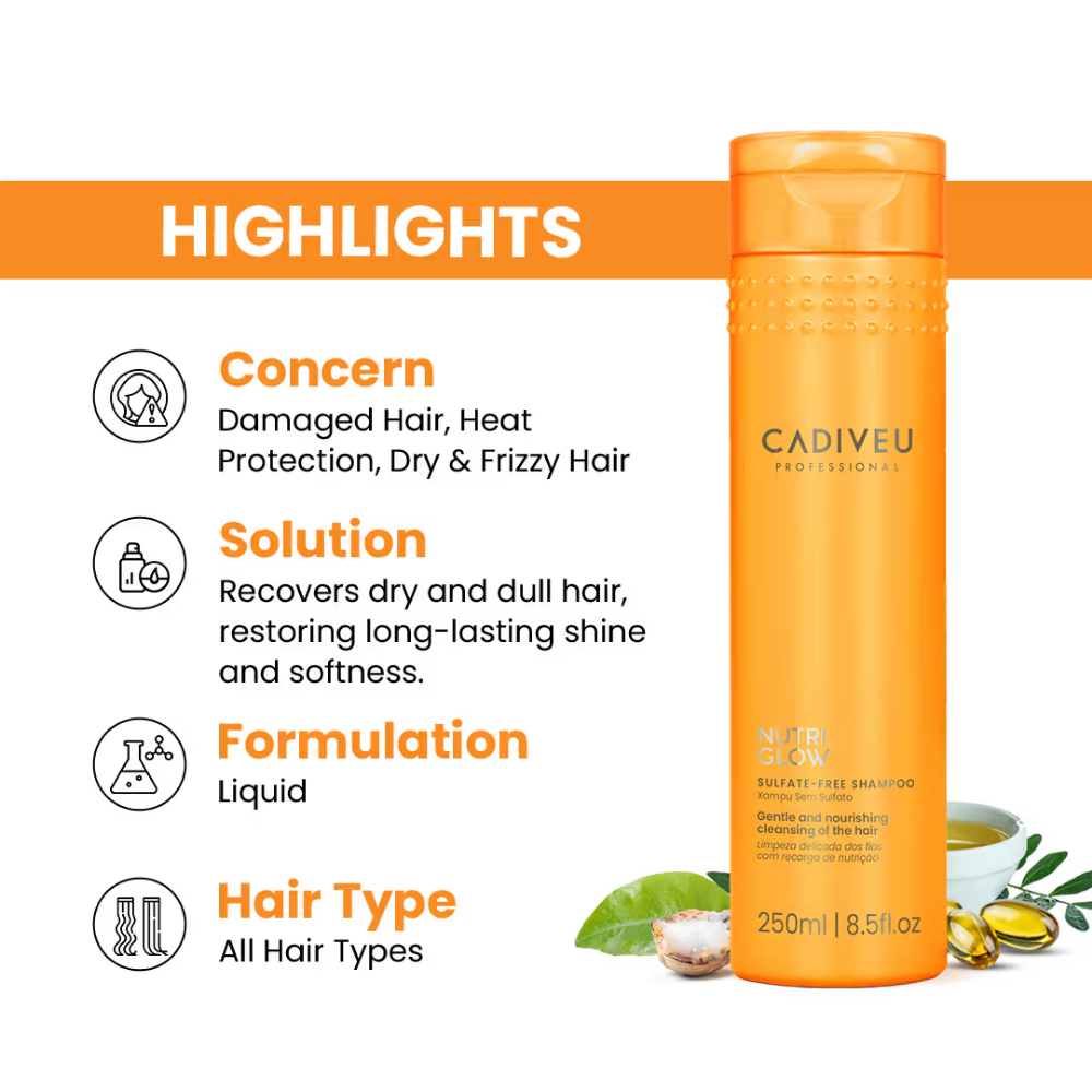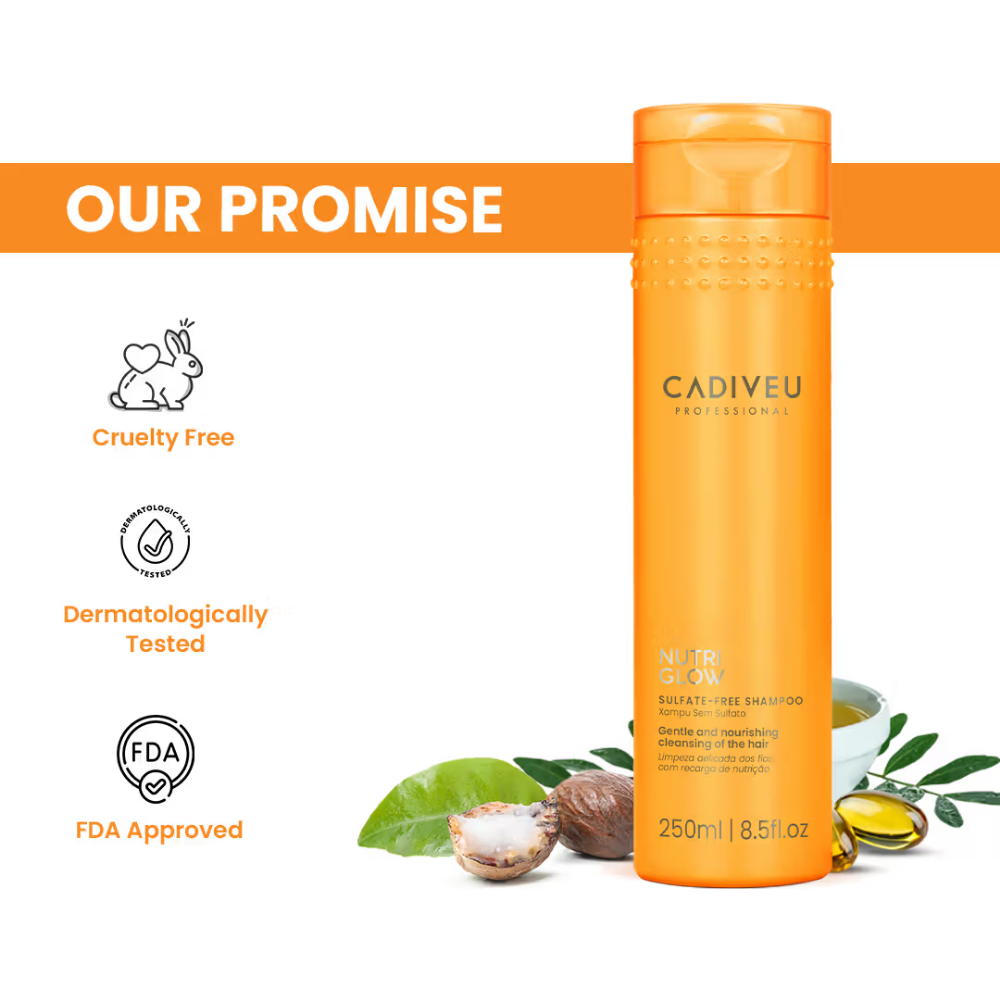 Nutri Glow Sulfate-Free Shampoo is specially formulated to rescue dry and dehydrated hair by restoring essential moisture and bringing back vitality to dull strands. It gently cleanses without stripping away natural oils, making it ideal for preserving the delicate structure of dry and damaged hair. Enriched with nourishing ingredients, it enhances long-lasting shine, smoothness, and softness from the very first wash.Designed to protect the hair’s natural integrity, this shampoo helps prevent further dryness or breakage, promoting stronger, healthier strands over time. Its lightweight yet effective formula provides a deep, hydrating cleanse while maintaining the hair’s natural balance. Suitable for all hair types and textures, it offers visible nourishment without weighing hair down. With regular use, hair becomes softer, more manageable, and noticeably healthier, making it a perfect choice for anyone seeking gentle care and professional results.