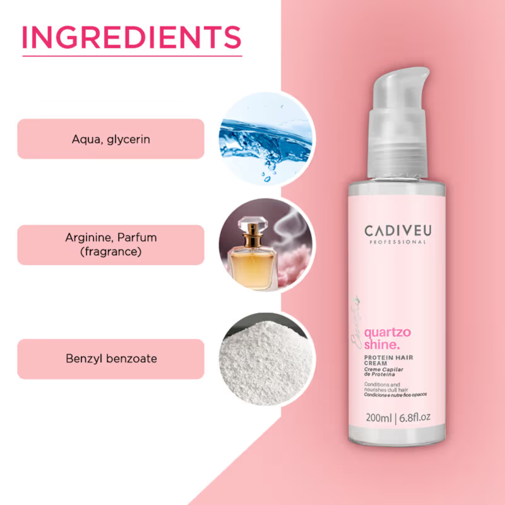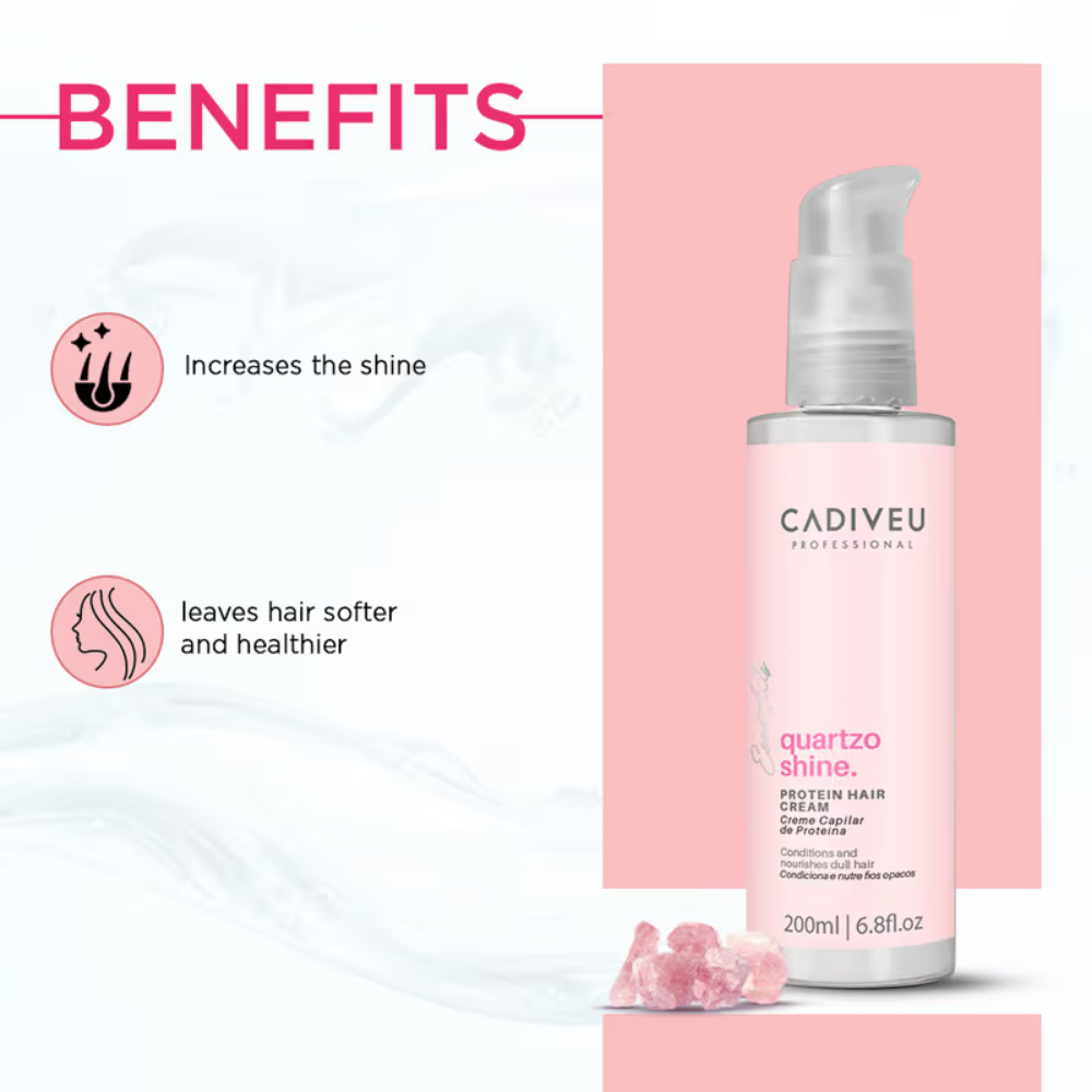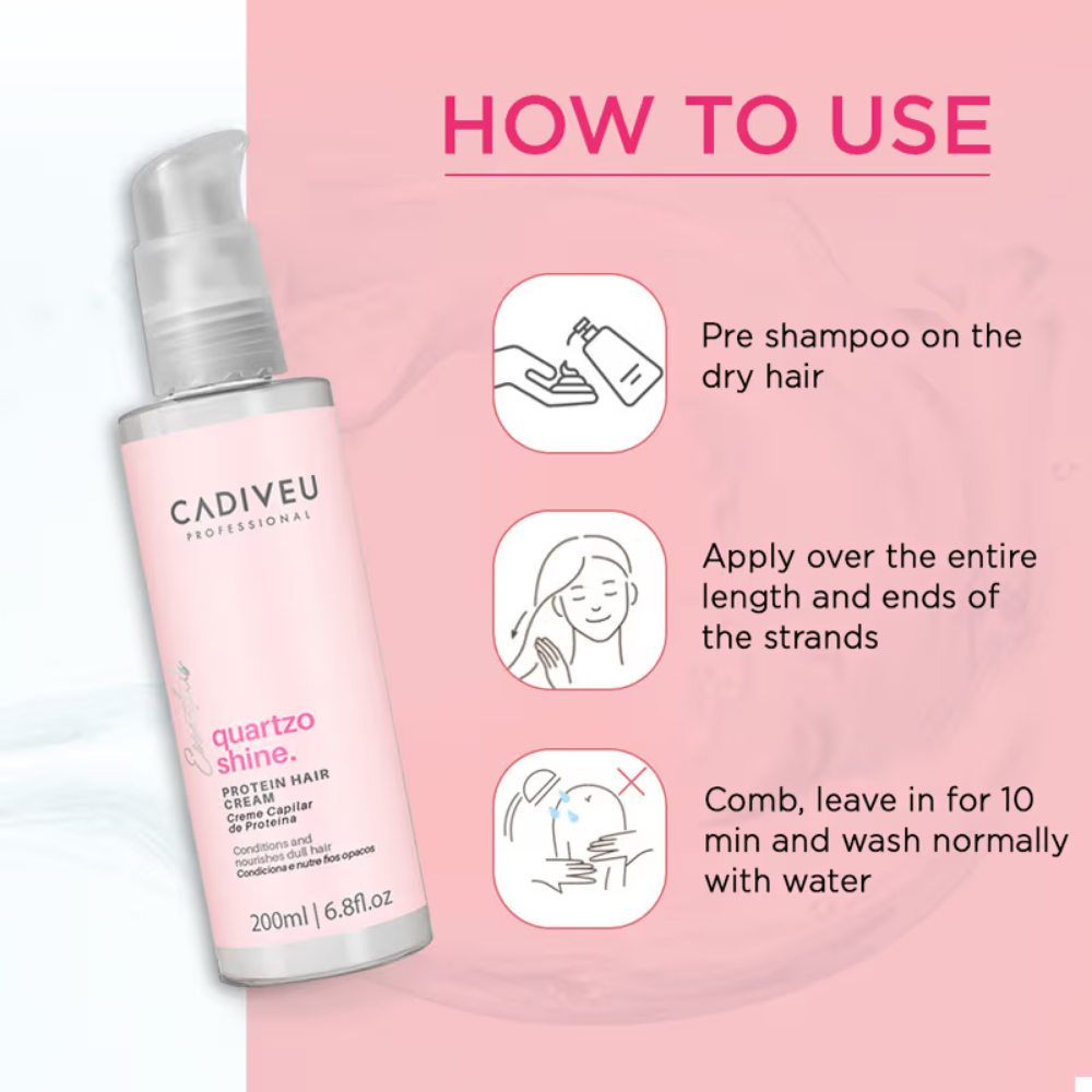 - With dry hair, apply the Quartzo Shine Protein abundantly to the lengths and ends of the hair. Leave it on for at least 10 minutes. Rinse and wash with Quartzo Shine Shampoo. TIP: use it before going to the gym or as a hair protector before being exposed to the sun, swimming pool, or sea.