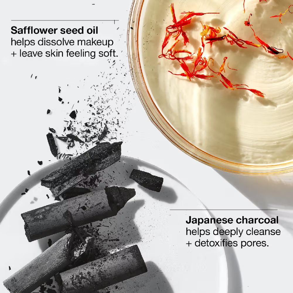 • Safflower seed oil: Works efficiently to help break up natural oil found on skin, plus dissolves hard-to-remove makeup. Rich in linoleic acid, this natural emollient helps leave skin feeling soft and nourished.Full Ingredient List: Ethylhexyl Palmitate, Carthamus Tinctorius (Safflower) Seed Oil, Caprylic/Capric Triglyceride, Sorbeth-30 Tetraoleate, Synthetic Wax, Peg-5 Glyceryl Triisostearate, Charcoal Powder, Tocopherol, Caprylyl Glycol, Water/Aqua/Eau, Silica Dimethyl Silylate, Phenoxyethanol