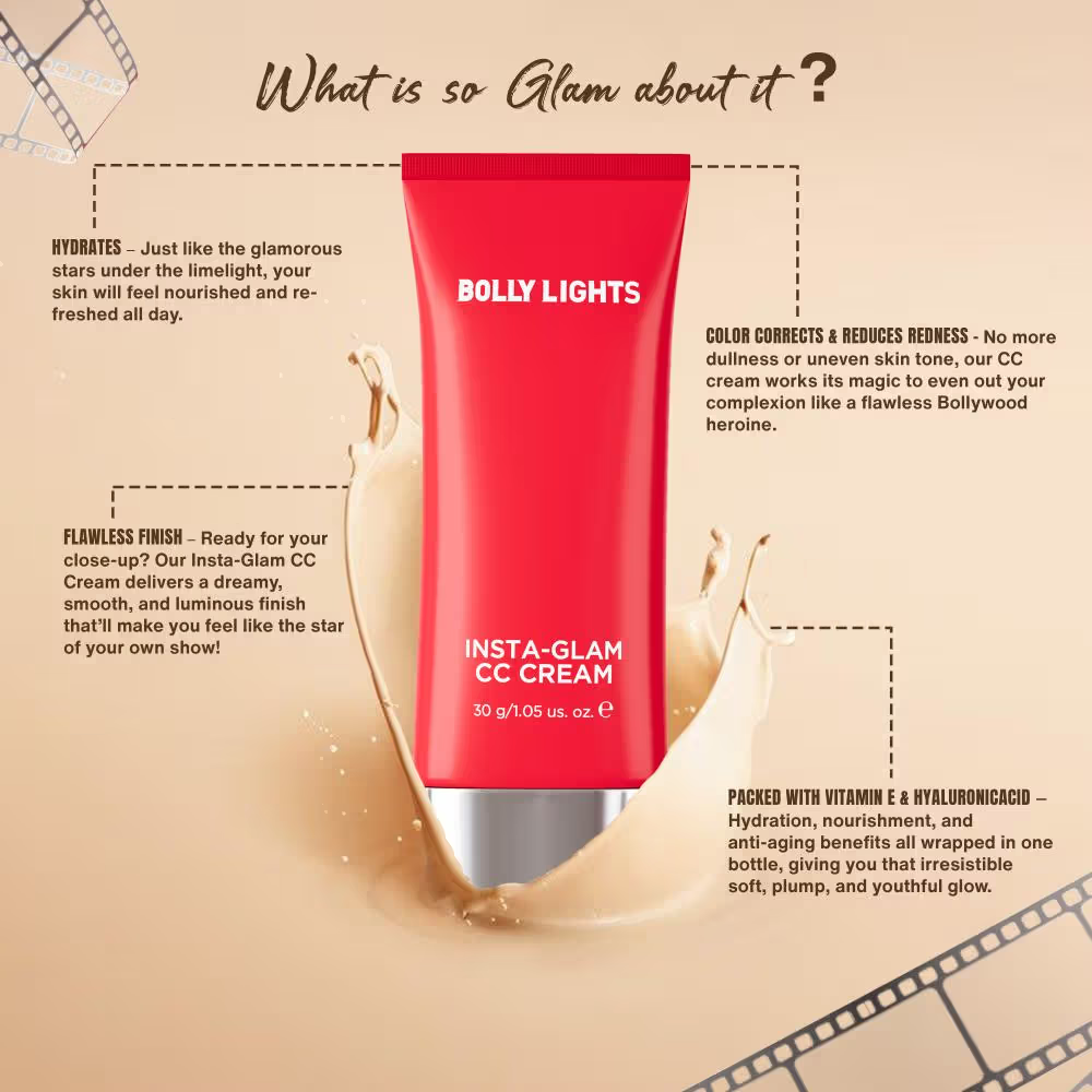 Our Insta-Glam CC Cream is inspired by social media and the lights of Bollywood. It hydrates, color corrects, reduces redness, and evens out skin to give you the most magical, flawless finish ever!
