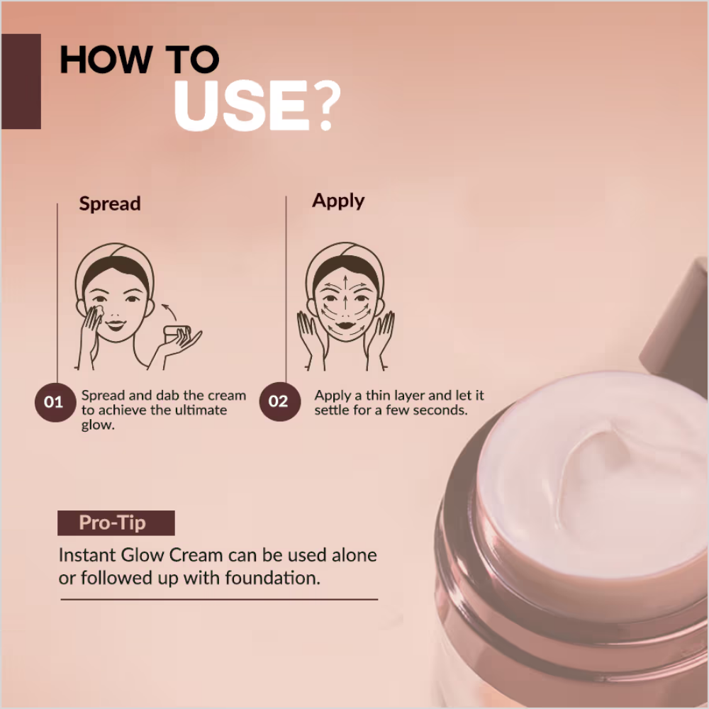 Colorbar Instant Glow Cream is a specially formulated cream that brings your skin to life, giving it an instant glow and radiance in just 28 seconds. It features a unique ‘color complex plate (CCP) formula’ that immediately corrects unbalanced skin tone with an effect that looks natural and bright. This is further combined with our ‘vitamin B5 moisturising complex’ that has the hydrating power to soften and relax your skin. When natural light falls on your skin, the cream’s reflective nature will reveal a healthy glow with lesser discoloration. Together this formula provides instant and long-term toning effect with lustrous skin.