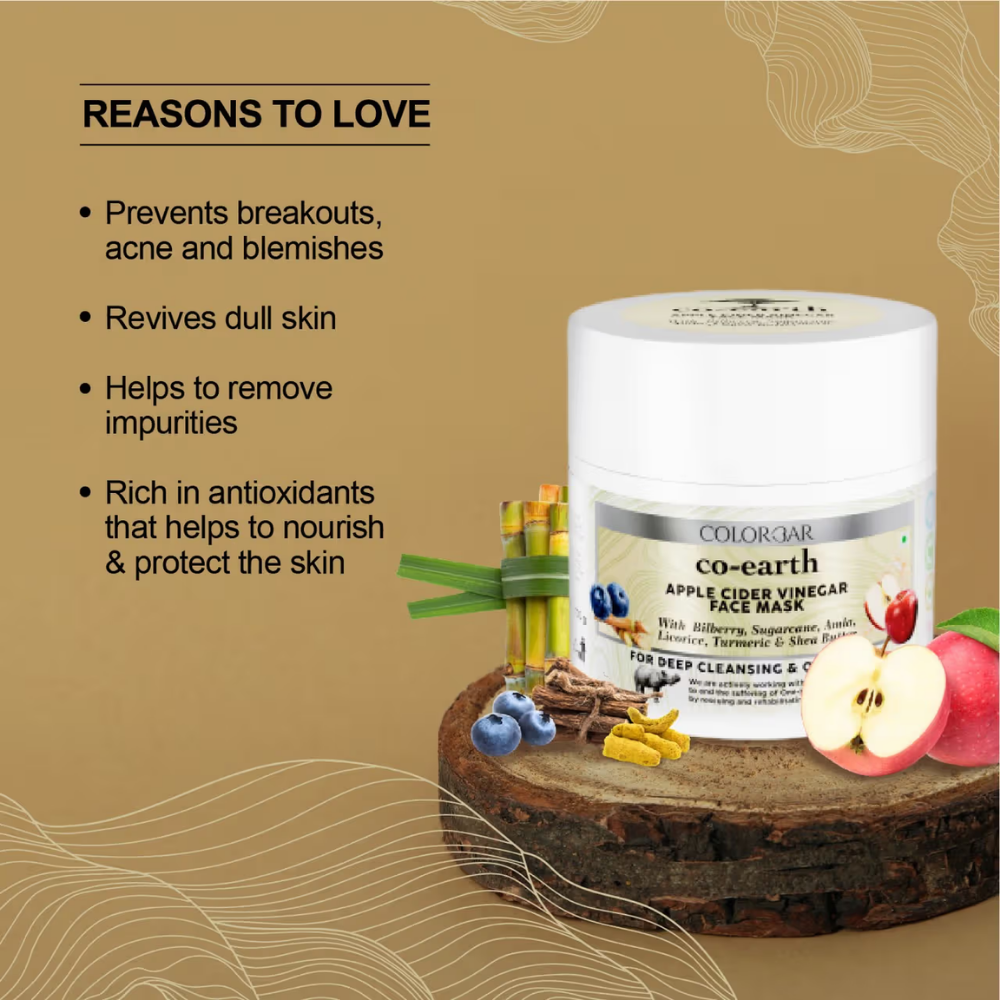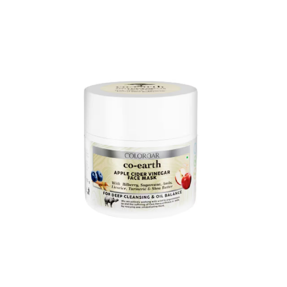 Colorbar Co-earth Apple Cider Vinegar Face Mask is a deep cleansing and purifying face mask loaded with the goodness of apple cider vinegar and turmeric oil that helps to unclog blocked pores and prevent breakouts, leaving the skin flawless and radiant. Both are known for their antibacterial properties and are naturally purifying. Enriched with bilberry and amla extracts that are rich in antioxidants that help to rejuvenate dull skin and fight signs of ageing. Kaolin clay helps to deeply cleanse the skin and remove excess oil. Apply all over face and neck, 2-3 times a week for acne and blemish free skin.