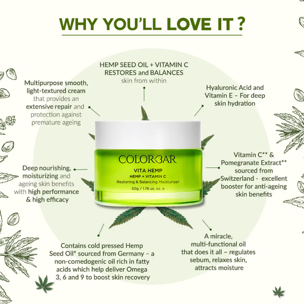 Purified Water, Caprylic Capric Triglyceride, Glycerin, Propanediol, Cannabis Sativa (Hemp) Seed Oil, Coco-Caprylate/Caprate, Sodium Acrylates Copolymer, Lecithin, C15-19 Alkane, Saccharide Isomerate, Citric Acid, Sodium Citrate, Maltodextrin, Punica Granatum Flower Extract, Sodium Ascorbyl Phosphate, Cetearyl Alcohol Ceteareth-20, Olea Europaea (Olive) Fruit Oil, Cocos Nucifera (Coconut) Oil, Simmondsia Chinensis (Jojoba) Seed Oil, Phenoxyethanol, Ethylhexylglycerin, Sodium Benzoate, Potassium Sorbate, Butylene Glycol, Dextran, Tripeptide-1, Sodium Hyaluronate, Carbomer, Titanium Dioxide, Tocopheryl Acetate, Sodium Gluconate, Perfume
