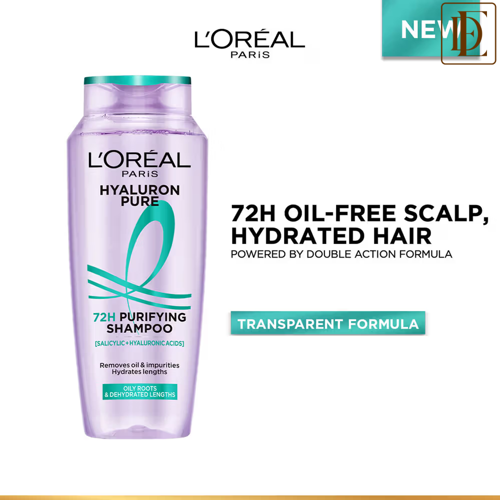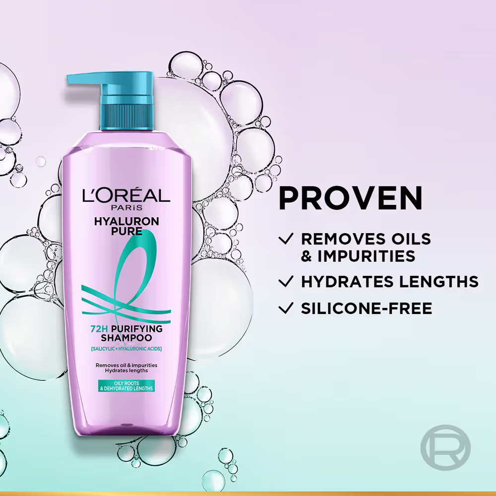 - Step 1: Apply L’Oreal Paris Hyaluron Pure 72H Purifying Shampoo on wet hair.Massage your scalp, cleansing from roots to tips.This step removes 99% of excess oil, leaving your scalp feeling refreshed and clean without irritation.