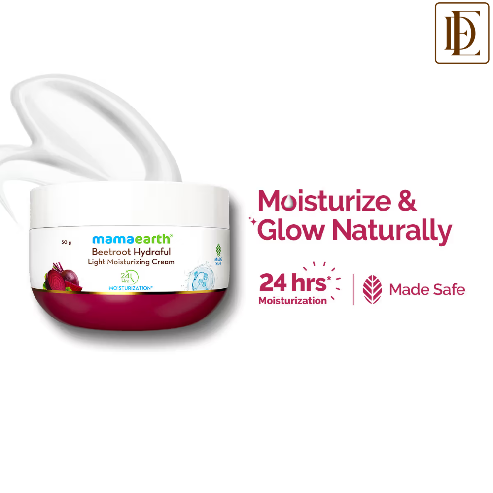 With great power comes great responsibility. And this superhero cream surely fulfils all its responsibilities & more!Here comes flying in, Mamaearth Beetroot Hydraful Light Moisturizing Cream to rescue you from the hassles of dryness. With 24 hours of moisturizing* power, this cream banishes flakiness and unleashes a natural pink glow. Being lightweight & quick to absorb, it makes sure the villain – greasiness, causes no trouble.Meet the ingredients that make this hero unstoppable! First up, Beetroot brings a pink radiance to your complexion. Then, Hyaluronic Acid enters, providing deep hydration and improving skin elasticity. Glycerin joins the team, locking-in the moisture to keep your skin feeling fresh and ready even for dry winters. Finally, this cream is an all-rounder perfect for your face, hands and body!Rest assured Beetroot Hydraful Light Moisturizing Cream is Made Safe Approved. This means, you’ll be safe from any SLS/SLES, Parabens, LLP, Mineral Oils, Silicons or artificial colors. Suit up with our hero to lock-in moisture and unlock your glow!*Based on clinical study done vs untreated skin by an Independent Research Organization in 2024.