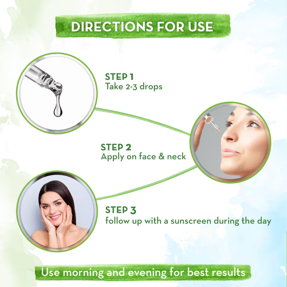• Use the pipette glass dropper to apply the serum directly on the face, twice a day.