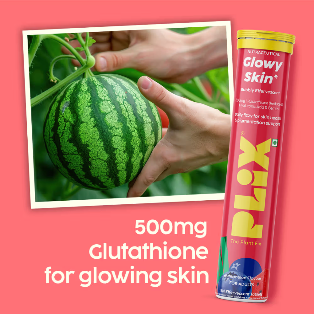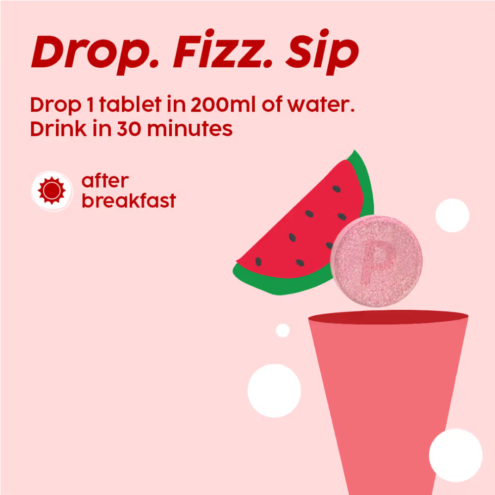 Quench your skin’s thirst with the refreshing watermelon flavor of PLIX Glowy Skin effervescent! Bursting with antioxidants, these multivitamin tablets don’t just taste amazing – they clear acne, delay signs of aging, and fight free radicals, leaving you with skin that’s youthful and radiant. All the benefits of glowing skin in a juicy watermelon treat! Packed with a powerful blend of glutathione, hyaluronic acid, aloe, acai, blueberry, vitamin C, and E, this plant-based supplement is the ultimate age-defying boost your skin needs. Super berries and vitamin C work together to support collagen production, which helps regenerate new skin cells to treat blemishes, pigmentation, and uneven tone. Meanwhile, hyaluronic acid dives deep into your skin to deliver intense hydration and nourishment.