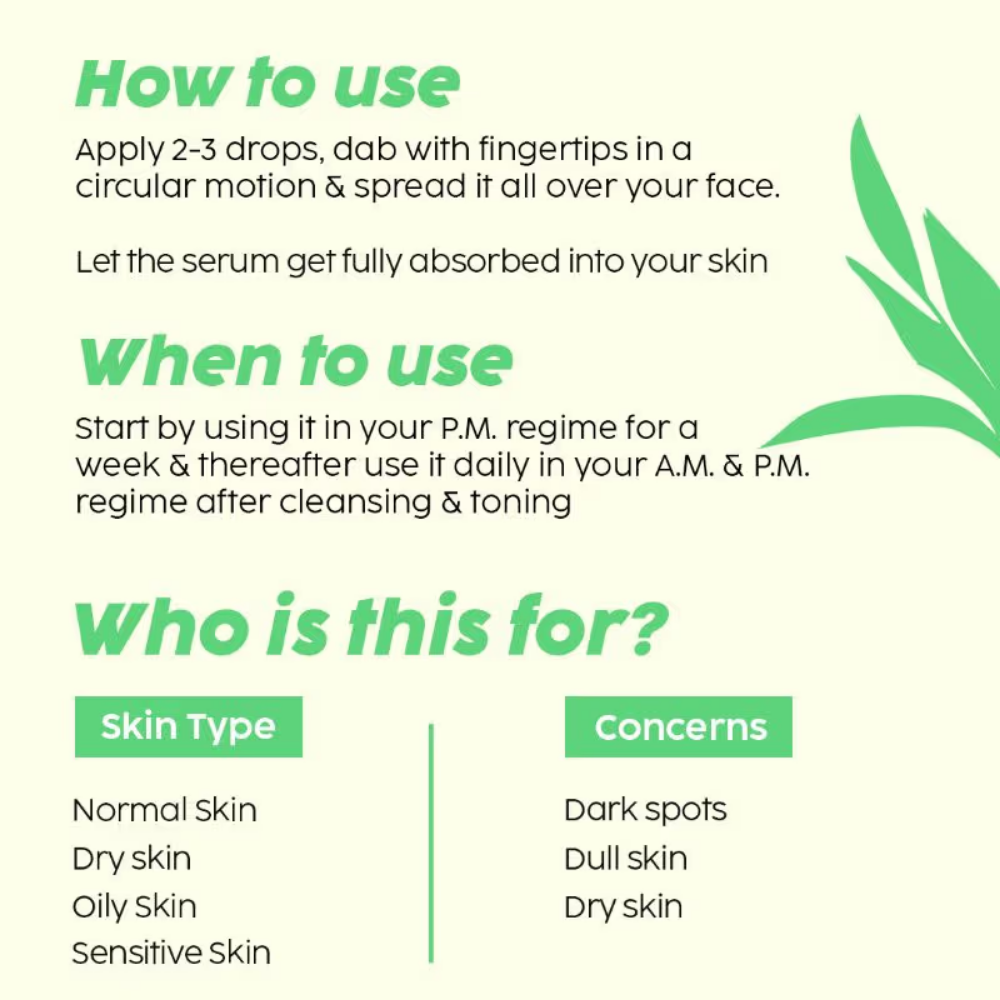 - Apply 2 to 3 drops of serum to clean, dry skin, & dab on the areas of application gently. Spread gently across your face & neck. Start with using it in your P.M. regime for a week & thereafter use it daily in your A.M. & P.M. regime after cleansing & toning.