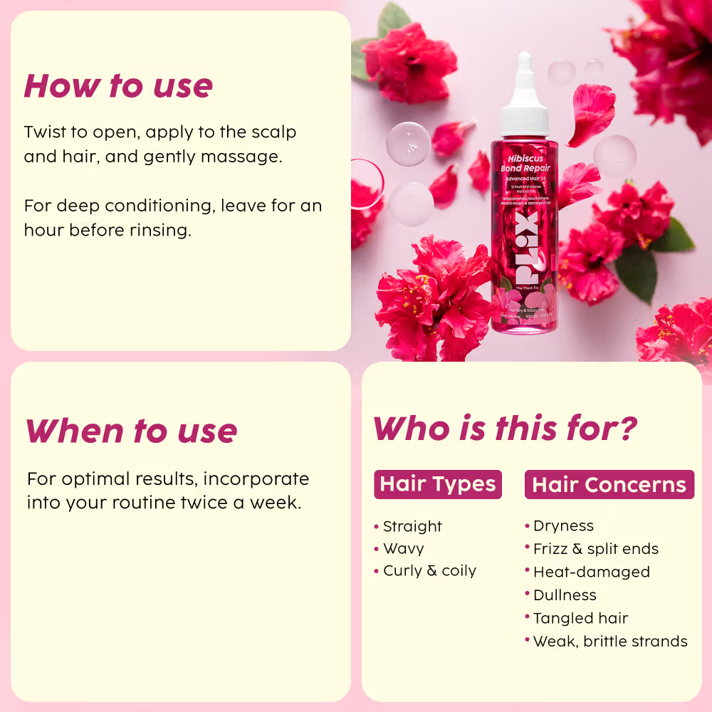Hibiscus Bond Repair Advanced Hair Oil is a luxurious, deeply nourishing treatment that combines the power of 12 nutrient-rich oils, including Hibiscus Oil, Brahmi Oil, and Vitamin E, to repair and protect hair from root to tip. This innovative formula works wonders by penetrating deeply into the hair shaft, delivering intense hydration, strength, and shine. It targets weak, damaged, and dry hair, reducing breakage, split ends, and frizz, leaving hair feeling smooth, soft, and revitalized. The blend of oils also provides natural heat protection, ensuring your hair is shielded from styling damage. Ideal for all hair types, this oil not only helps restore moisture but also enhances manageability, making hair easier to style and control. With regular use, it promotes healthier, shinier hair with long-lasting smoothness, making it an essential part of your hair care routine. For the best results, incorporate this oil twice a week for an intense, nourishing treatment that transforms your hair with every use.