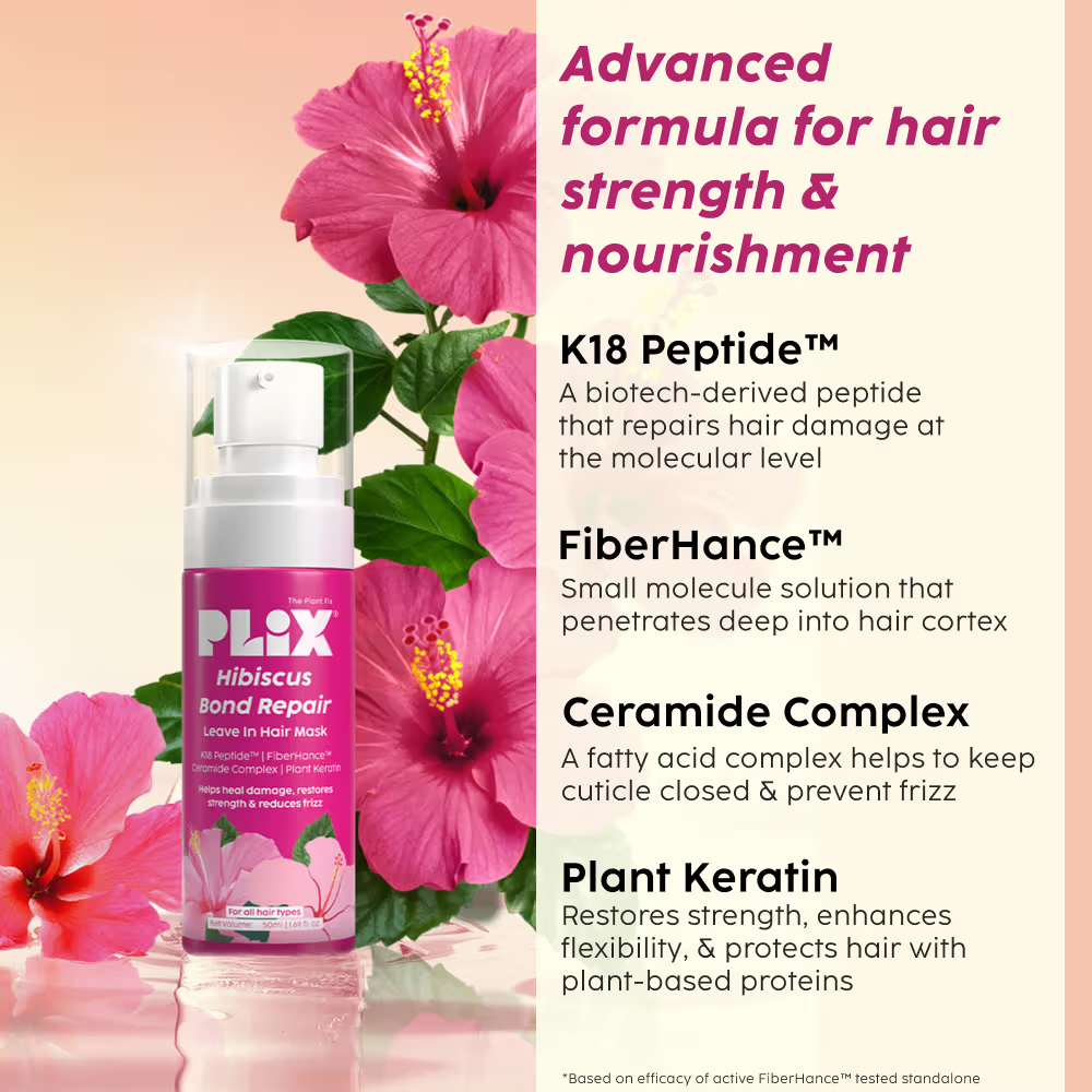 Revitalize and restore your hair with the Plix Hibiscus Bond `Repair Leave-In Hair Mask. This advanced treatment deeply nourishes, repairs, and strengthens hair from within, targeting damage, frizz, and breakage, it penetrates deep into the hair’s core, reconnecting broken keratin bonds to restore elasticity and strength. FiberHance works to reinforce the hair structure, making hair 3X stronger and more resilient, preventing breakage.The Ceramide Complex locks in moisture, smoothing the hair cuticle and reducing frizz for shiny, manageable hair. Plant Keratin nourishes and strengthens from root to tip, improving elasticity and preventing split ends. Whether your hair is chemically treated, heat-damaged, or brittle, this leave-in mask provides long-lasting hydration, smoothness, and protection without weighing hair down. Ideal for daily use, it helps restore softness, strength, and shine to every strand. Perfect for those looking to revitalize, protect, and maintain healthy hair, this mask is sulfate-free, paraben-free, and vegan.