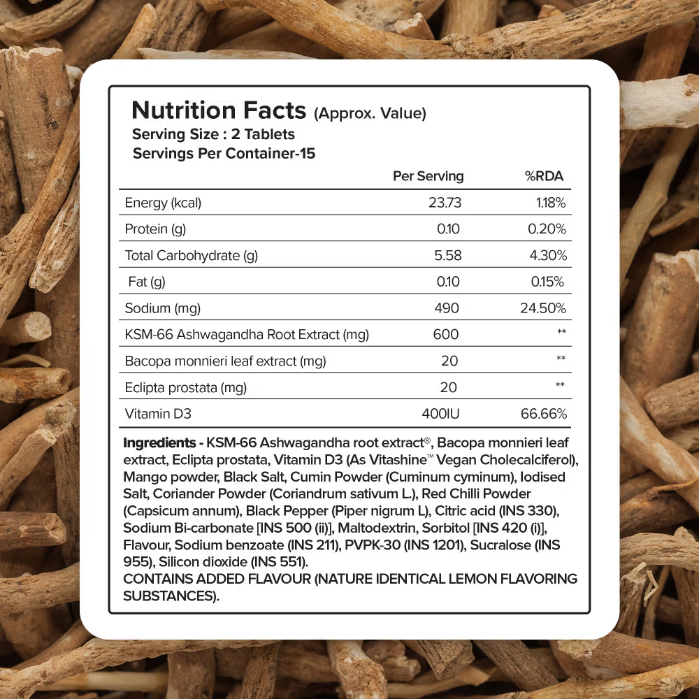 Full Ingredient List: Citric acid (Acidity regulator) [INS 330], Sodium bicarbonate (Acidity regulator) [INS 500 (ii)], Dextrose anhydrous, Ashwagandha Extract (Withania somnifera), Sorbitol [INS 420 (i), Lemon Flavour, Sodium benzoate (INS 211), Lubrication, PKV-30 (INS 1201), Mango Powder, Black Salt, Cumin Powder, Iodised Salt, Coriander Powder, Red Chilli powder, Celery, Black Pepper, Ginger, Sweetener (INS 955), Brahmi Extract, Bhringraj Extract, Vitamin D3