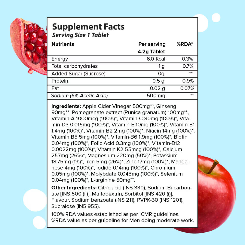 Full Ingredient List: Apple Cider Vinegar 500mg, Ginseng 90mg, Pomegranate Extract (Punica Granatum) 100mg, Vitamin-A 1000 mcg (100%), Vitamin-C 80mg (100%), Vitamin-D3 0.015mg (100%), Vitamin-E 10mg (100%) , Vitamin-B1 1.4mg (100%), Vitamin-B2 2mg (100%) , Niacin 14mg (100%), Vitamin B5 5mg (100%), Vitamin-B6 1.9mg (100%), Biotin 0.04mg (100%), Folic Acid 0.3mg (100%), Vitamin-B12 0.0022mg (100%), Vitamin K2 55mcg (100%), Calcium 257 mg (26%), Magnesium 220mg (50%), Potassium 18.75mg (1%), Iron 5mg (26%), Zinc 17mg (100%), Manga nese 4mg (100%), lodide 0.14mg (100%), Chromium 0.05mg (100%), Molybdate 0.045mg (100%), Selenium 0.04mg (100%), L-arginine 50mg.