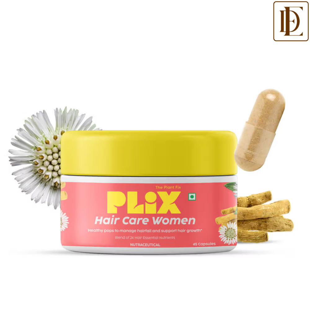 Plix Hair Care 45 Capsules For Women is a combination of 24 essential hair nutrients that improve hair health by targeting the underlying causes of poor hair health. This helps women obtain stronger, voluminous hair and improve their scalp coverage. It contains the goodness of Bhringraj, Resveratrol, Lycopene, L-Cysteine, and many more nutrients that nourish scalp and hair health. It contains DHT blockers like Lycopene that reduce hair fall and hair thinning. It also improves blood circulation to hair follicles which helps repair damaged hair. It helps increase hair growth by revitalizing and strengthening hair follicles and provides a much-needed keratin replenishment to your hair in the most natural way.
