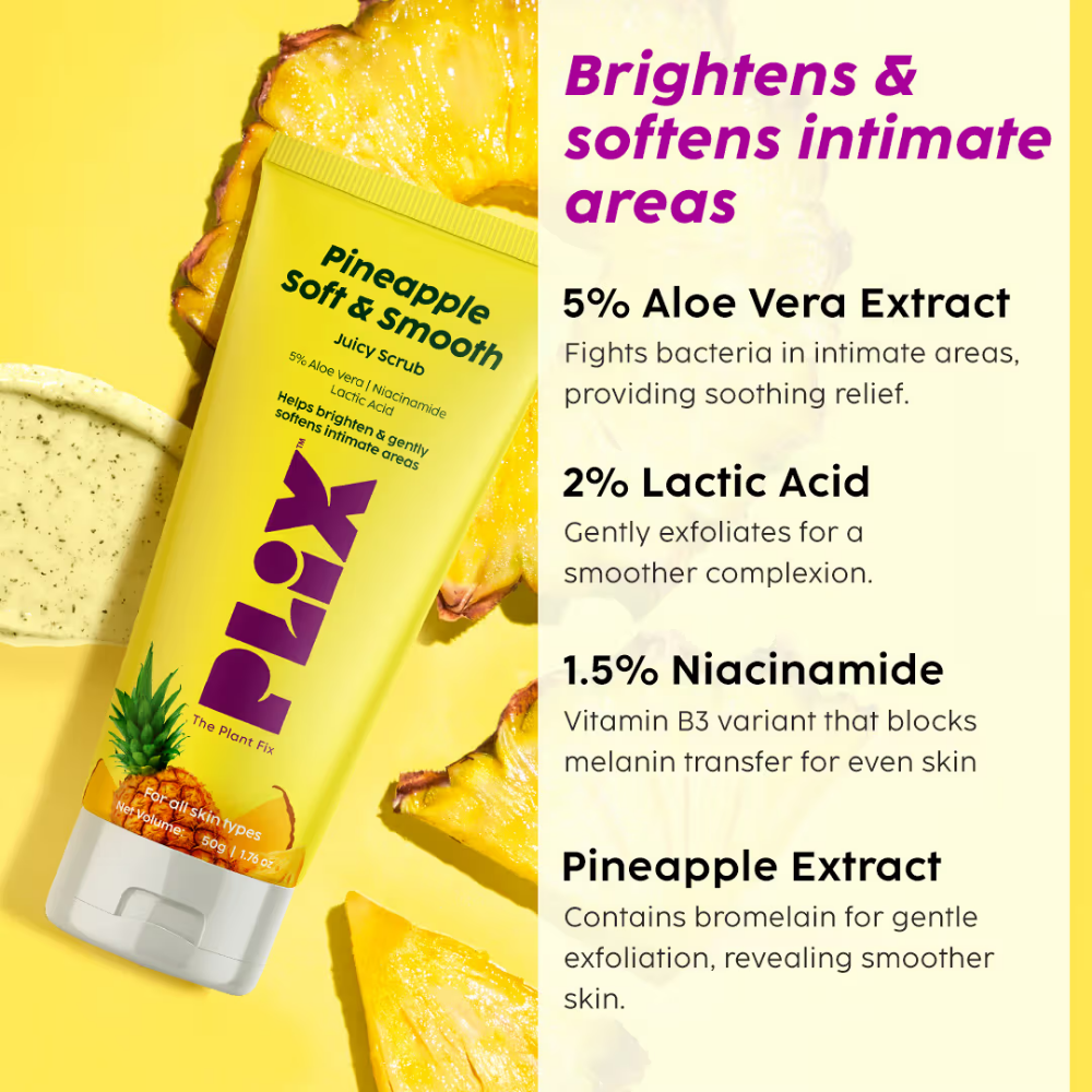 Introducing our Plix Pineapple Soft & Smooth Juicy Scrub, a skincare marvel crafted for your intimate and targeted areas. This unique blend features Aloe Vera, known for its antibacterial properties, combating bacteria and fungi while providing a soothing barrier against itching and irritation. Lactic Acid, sourced from SOHO ANECO in China, offers gentle exfoliation, unveiling a fresh layer of skin. Niacinamide, a skin superhero, reduces pigmentation, promoting a brighter complexion. Pineapple Extract, enriched with bromelain, aids in effective dead skin exfoliation. Designed for easy application, simply take a generous amount, massage in circular motions for 1-2 minutes on intimate areas, as well as knees, neck, elbows, underarms, inner thighs, and bikini area. Rinse off for a revitalised and smooth sensation.