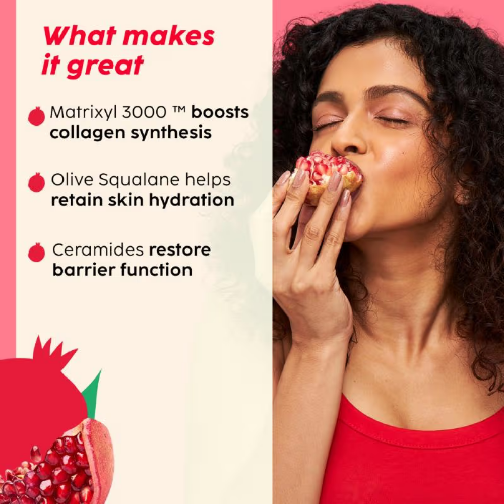 Olive Squalane, hyaluronic acid, Matrixyl 3000, Pomegranate Extract