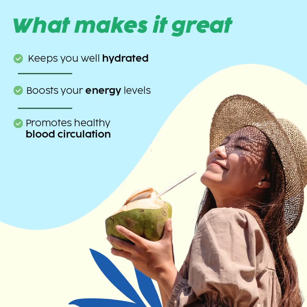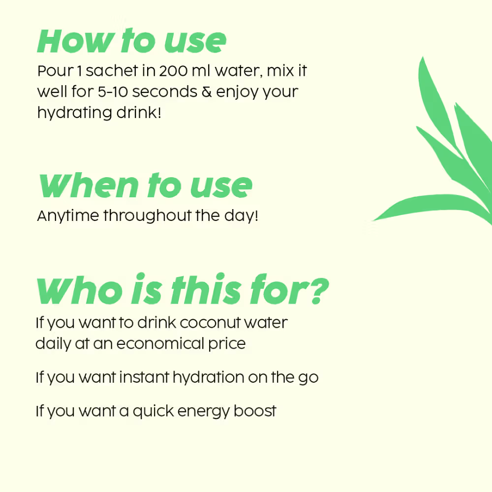 - Energetic drink: Handpicked from south Indian states, the coconuts are spray-dried into powder form to retain the nutrients and give you the real taste of coconut water that serves to refresh and re-energize you and help keep you hydrated.