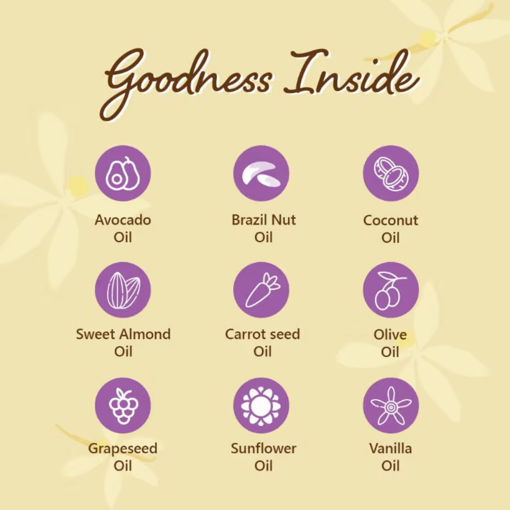 Full Ingredient List: Helianthus Annuus (Sunflower) Seed Oil, Ethylhexyl Palmitate, Isopropyl Myristate, Fragrance, Caprylic/Capric Triglycerides, Persea Gratissima (Avocado) Oil, Pentaerythrityl Tetra-di-t-butyl Hydroxyhydrocinnamate, Cocos Nucifera (Coconut) Oil, Olea Europaea (Olive) Fruit Oil, Vitis Vinifera (Grape) Seed Oil, Prunus Amygdalus Dulcis (Sweet Almond) Oil, Daucus Carota Sativa (Carrot) Seed Oil, Tocopheryl Acetate, Vanilla Planifolia Fruit Oil, Bertholletia Excelsa (Brazil Nut) Seed oil, Tocopherol.