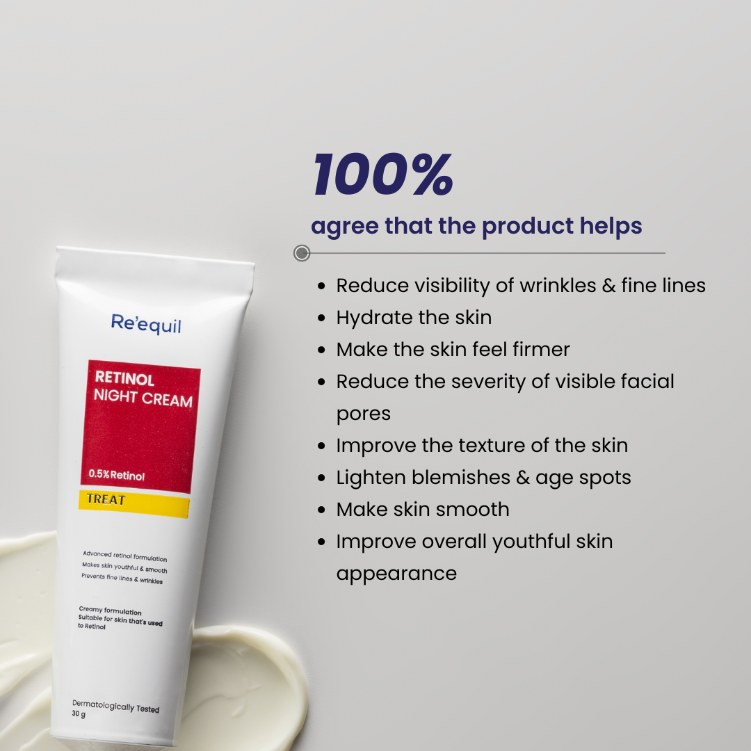 Based on clinical trials conducted on 36 individuals (male & female) for the efficacy of 0.5% Retinol Night Cream (Self Evaluation)