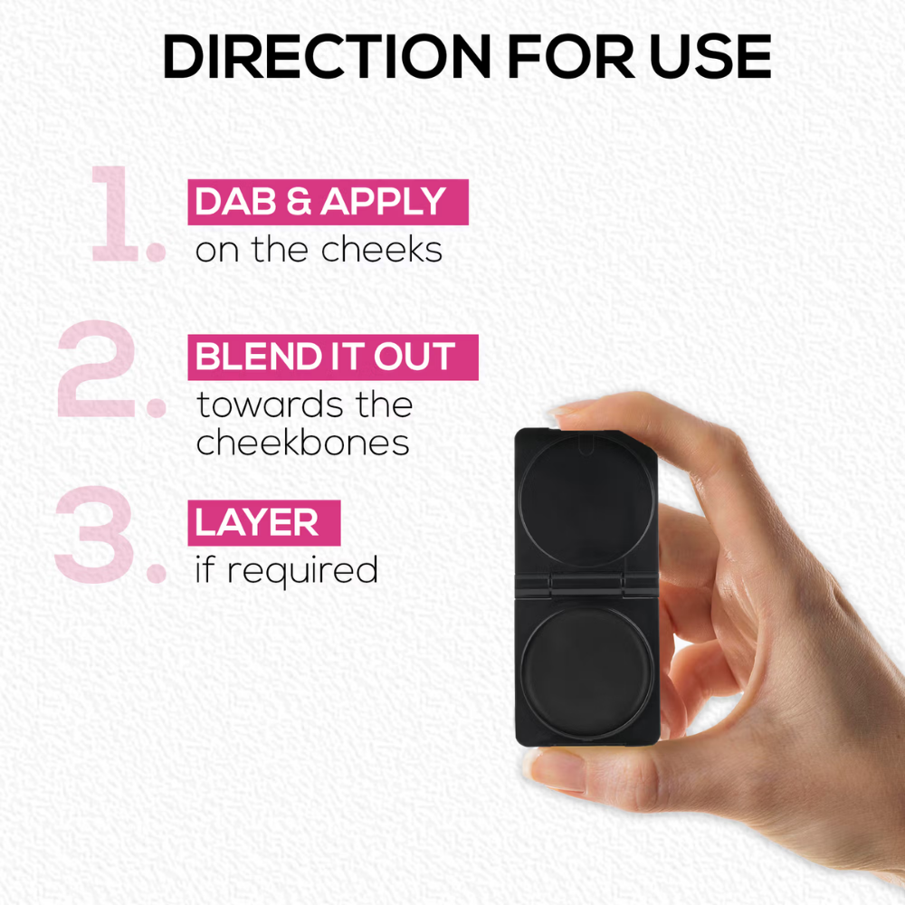 - Dab & blend with fingertips onto the apples of your cheeks and gently blend it out along the cheekbones. Can be layered for more intense color.