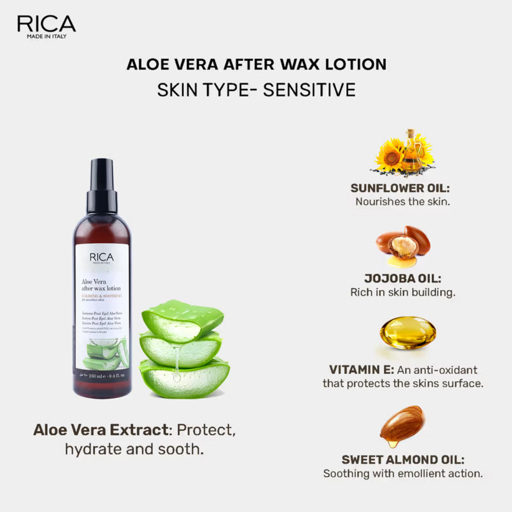 Renowned for its calming and anti-inflammatory properties, Rica After Wax Lotion is a sensitive skin lotion that removes any residual wax, soothing and moisturizing the stressed skin. It’s easy to absorb. While this lotion is priced extremely nominally, what stands out is its quickest possible absorption property. Most importantly, the calming influence of this lotion is perfectly complemented by its moisturizing properties. These dry lotions are non-greasy and rapidly absorbed into the skin. They quickly calm the normal redness that can occur when waxing and gently remove any wax residue. Their base formulas contain a mixture of natural oils that nourish and soothe the skin after depilation.