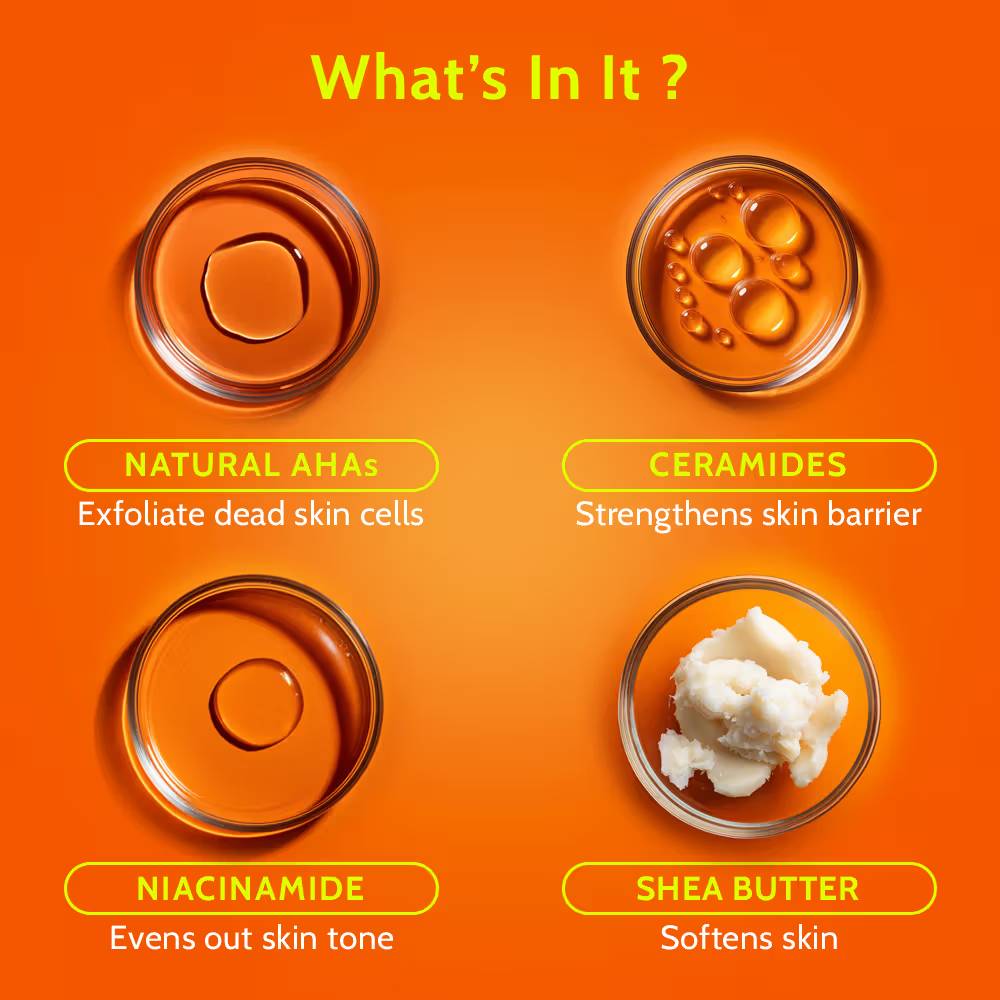 Purified Water, Stearic Acid, Cetearyl Alcohol, Polysorbate 60, Vaccinium Myrtillus Fruit/Leaf Extract, Saccharum Officinarum (Sugar Cane) Extract, Citrus Aurantium Dulcis (Orange) Fruit Extract, Citrus Limon (Lemon) Fruit Extract, Acer Saccharum (Sugar Maple) Extract, Glycerine, Glyceryl Mono Stearate, Helianthus Annuus (Sunflower) Seed Oil, Niacinamide, Propanediol, Cetyl Alcohol, Cyclopentasiloxane, Dimethiconol, Butyrospermum Parkii (Shea) Butter, Phenoxyethanol, Allantoin, Xanthan Gum, Sodium Acrylate/ Sodium Acryloyldimethyl Taurate Copolymer, Hydrogenated Polydecene, Trideceth-6, Sorbitan Laurate, Lactic Acid, Glycolic Acid, Tocopheryl Acetate, Sodium Hyaluronate, Rice (Oryza Sativa) Phytoceramides, Konjac (Amorphophallus) Phytoceramides, Phospholipids, Sphingolipids, Fragrance, Disodium EDTA