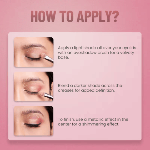 - Apply a light shade over your eyelids with an eyeshadow brush for a velvety base.
