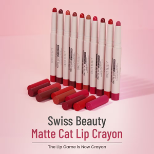 Introducing Swiss Beauty’s new retractable, water-resistant and lightweight Matte Cat Lip Crayon! This high-performance lip crayon features a non-transfer formula that ensures your lip colour stays put throughout the day, without smudging or smearing.Infused with nourishing Jojoba Oil and Vitamin E, this lip crayon not only provides stunning colour, but also helps to keep your lips healthy and moisturised. The lightweight formula ensures that your lips feel comfortable all day long, without any heaviness or stickiness.The soft matte finish of this lip crayon is perfect for those who prefer a more natural look, while still providing a bold and pigmented color payoff. Its convenient crayon and retractable format allows for precise application and effortless touch-ups throughout the day.Whether you’re heading to work or a night out, this lip crayon comes in a range of 26 stunning shades, from bold reds and pinks to subtle nudes and browns, so you can find the perfect color to suit your mood and style.