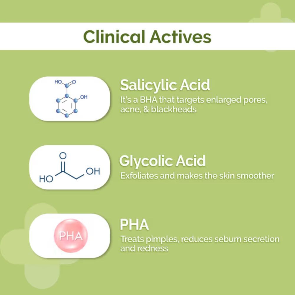 • Enriched with 1% salicylic acid, glycolic acid and zinc PCA