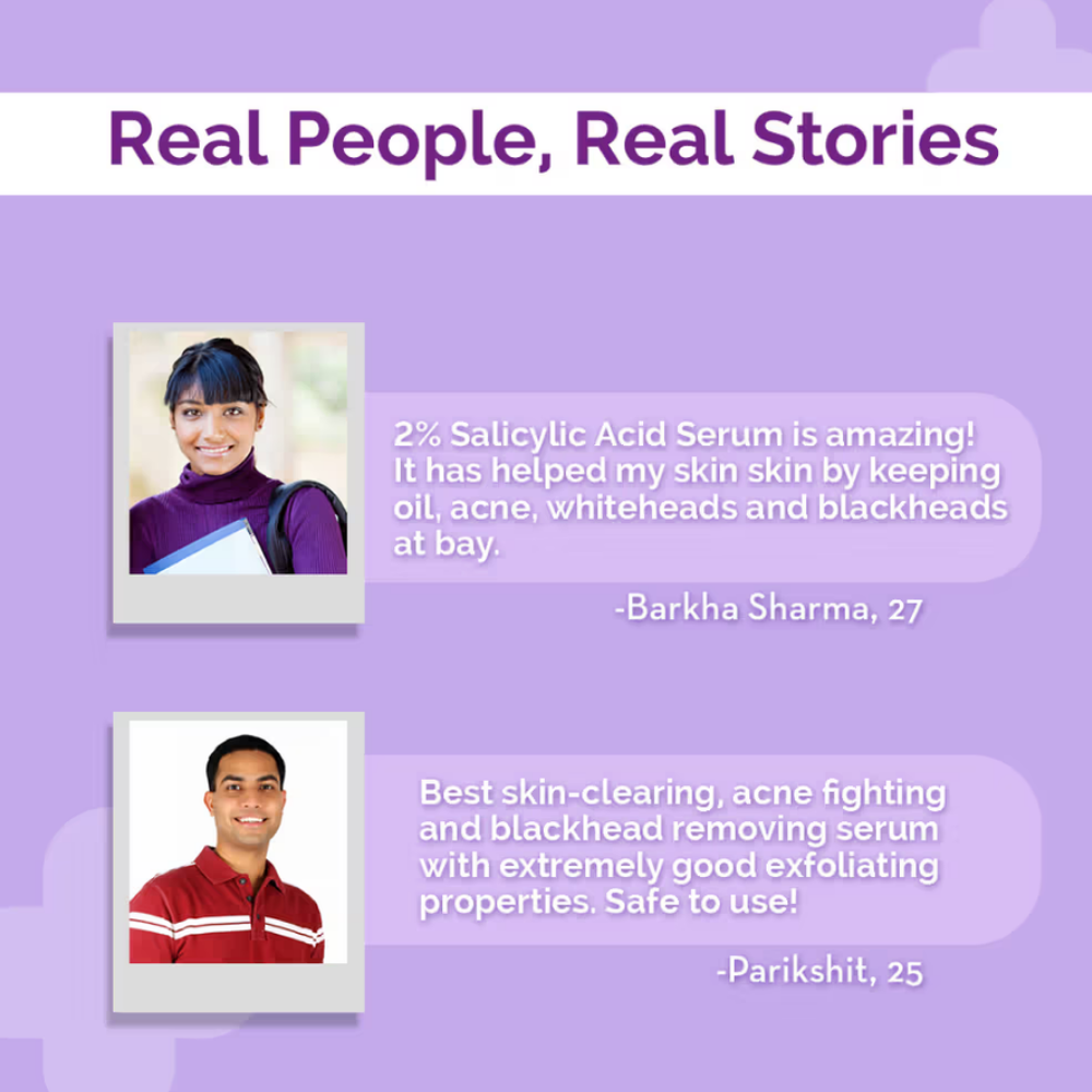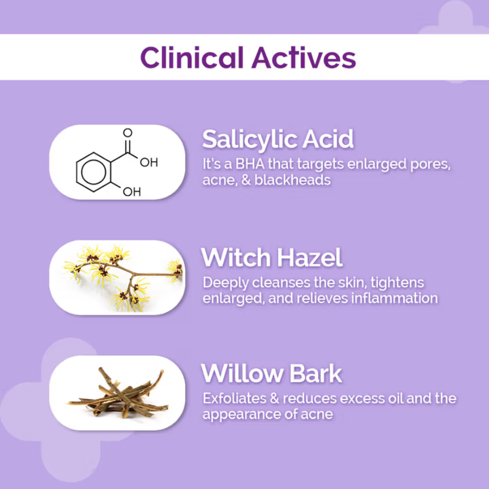 - TREATS ACNE: 2% Salicylic Acid intensely exfoliates and controls excess oil in the pores. It acts as a potent ingredient to treat existing pimples and acne and prevent further breakouts.