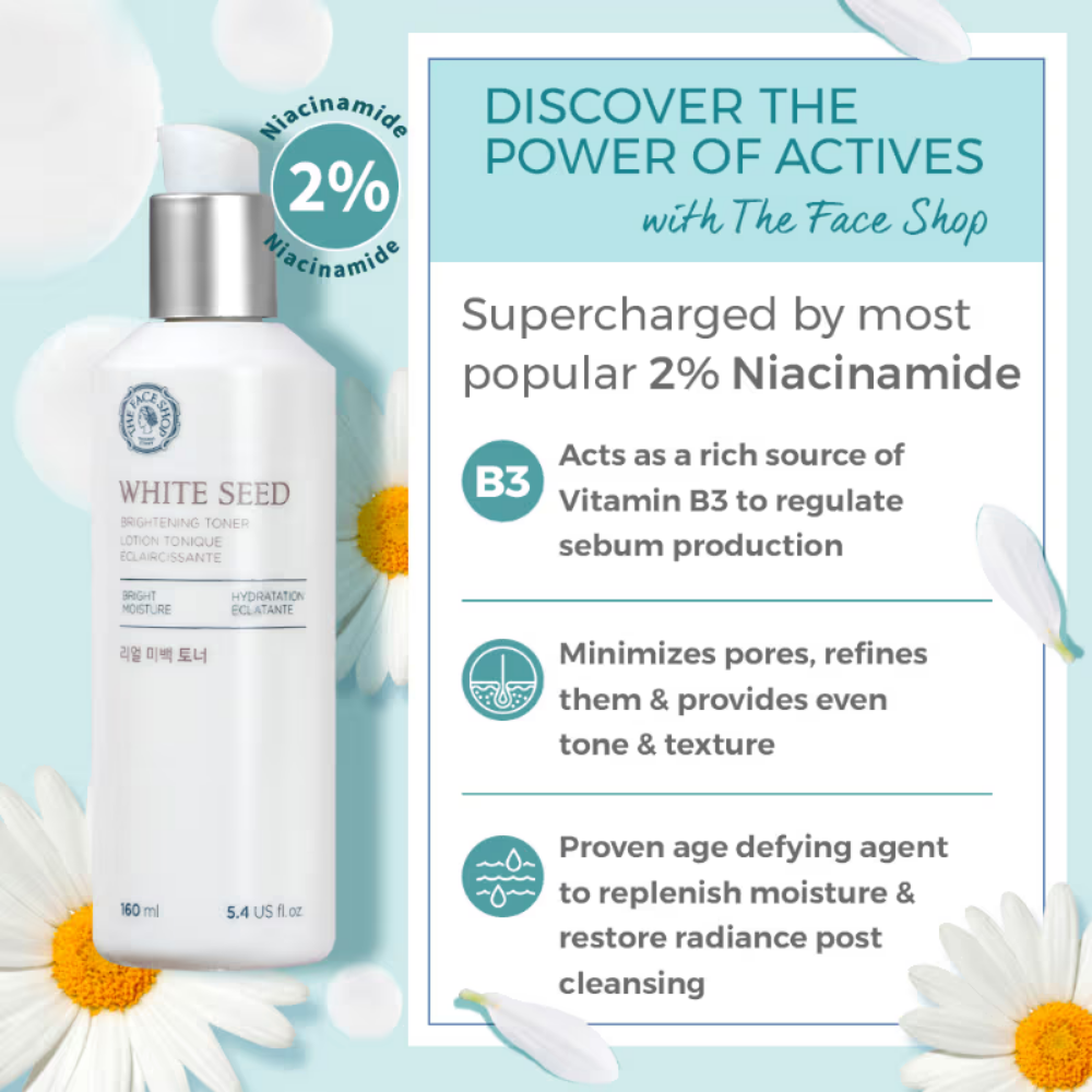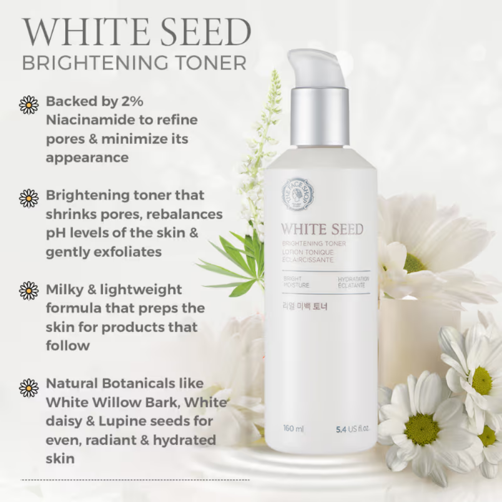 The Face Shop White Seed Brightening Korean Toner with Niacinamide for Dullness, Acne Scars & Pores (160ml)