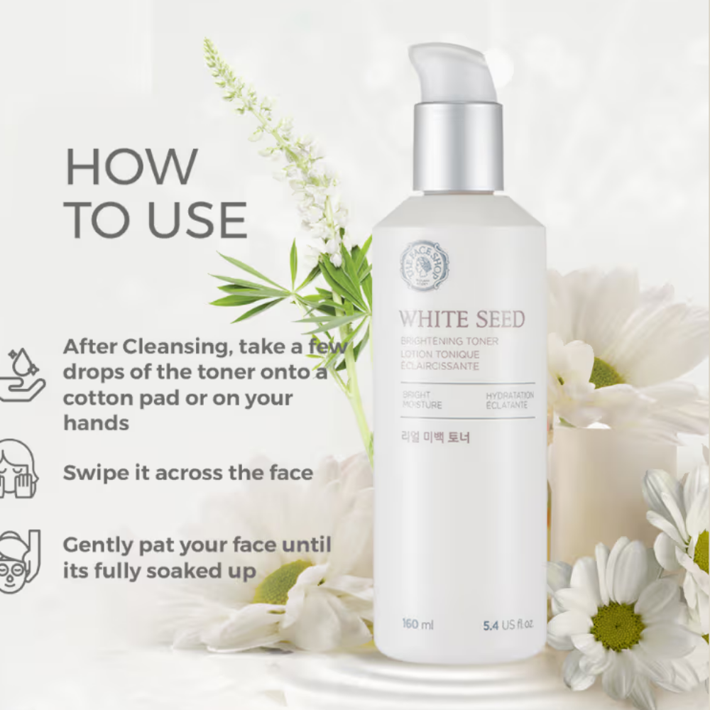 A skin brightening magic that keeps skin fair and clear! Introducing The Face Shop White Seed Brightening Toner – a translucent, brightening toner that helps brighten the skin and clear away dullness without leaving a sticky residue. Formulated with a compound of brightening ingredients such as white lupin seed, that contains a natural brightening substance, and white daisy flower extract, which helps in reducing dullness and makes skin look bright and clear. Here’s to showstopper skin ladies! It makes dull skin bright and clear. This product is dermatologically tested. Created to give you a gorgeous Korean beauty experience.