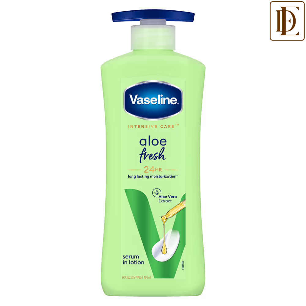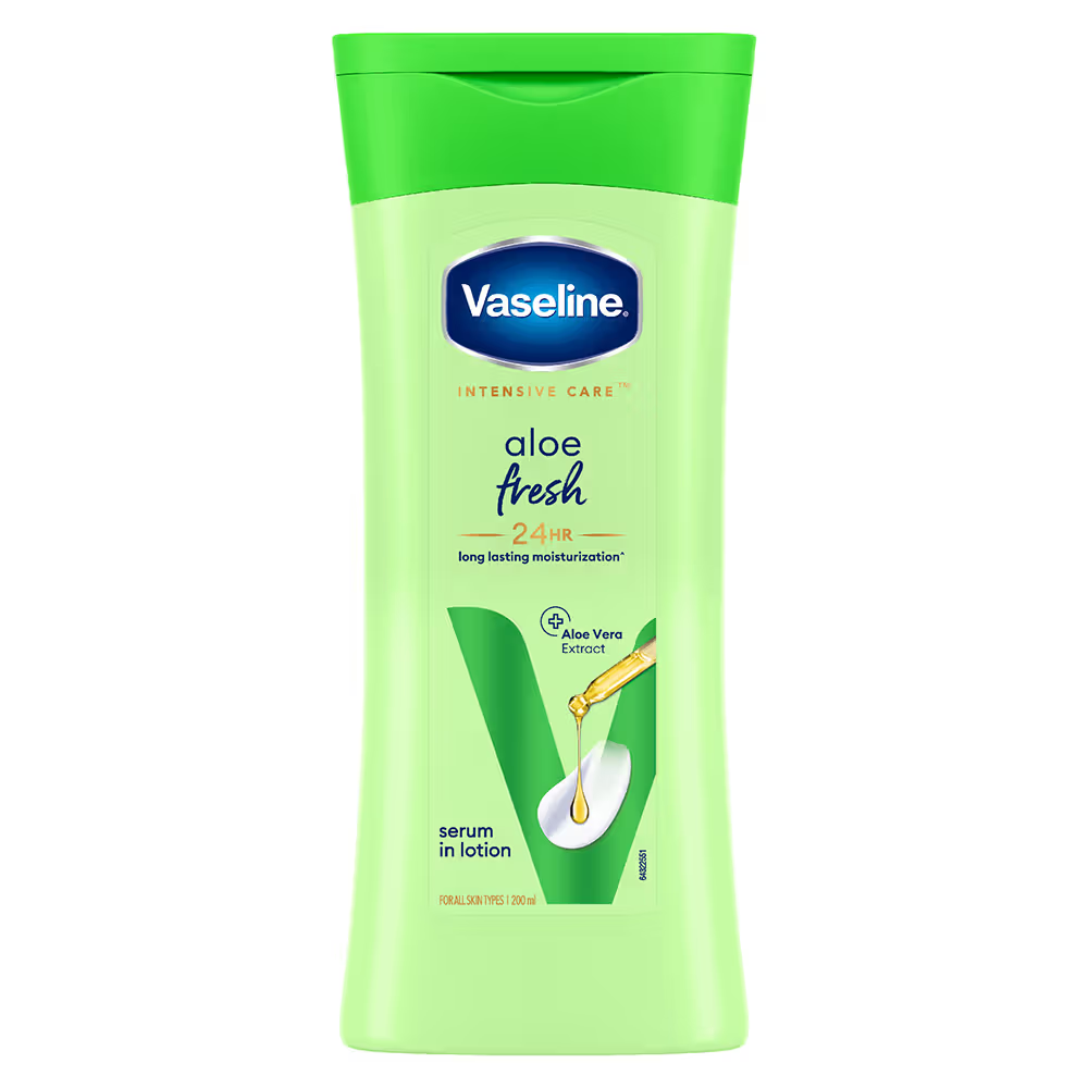 Vaseline Intensive Care Aloe Fresh Body Lotion is enriched with 100% pure aloe vera extracts and microdroplets of Vaseline jelly, restores skin’s moisture and helps maintain 24 hour hydration in skin. Aloe vera has long been used as a home ready to deal with dry flaky skin. It’s believed to have soothing properties to restore smooth supple skin and is effective at improving skin hydration. Aloe vera is an effective skin-conditioning which calms the skin and leaves it feeling deeply moisturized. Vaseline Jelly creates an extra layer of protection, preventing moisture from escaping and helping aid your skin’s natural recovery process.